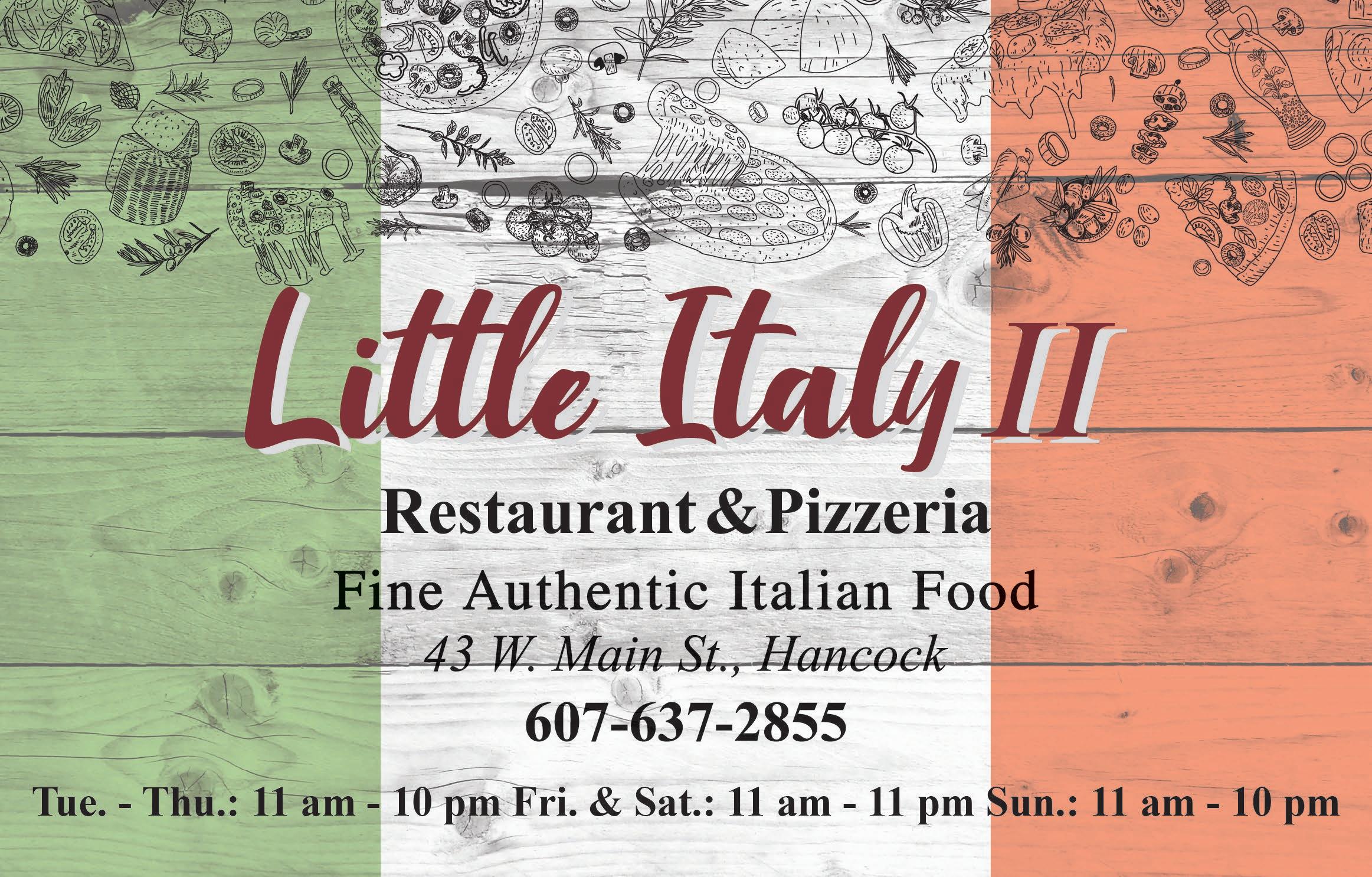 11 a.m. - 9 p.m. Closed Mondays Pizza, Subs & Pasta. Full Bar. (607) 637-2855