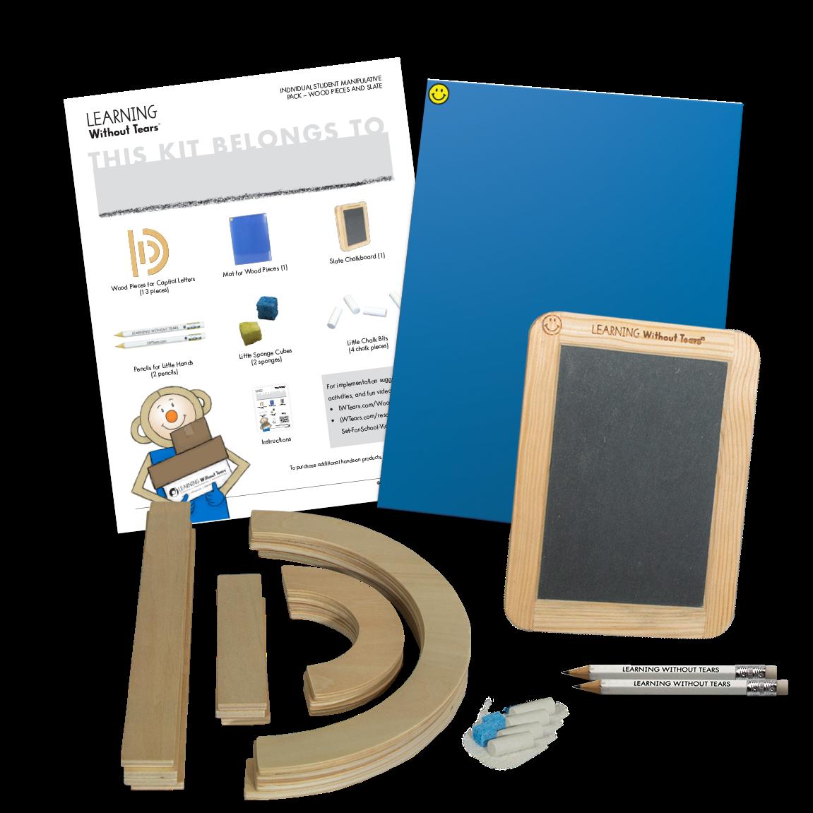 Prewriting and capital letters are fun to learn with this hands-on writing kit. My First School Book introduces coloring, drawing, counting, and beginning writing skills while the Wood Pieces, Mat, and Slate Chalkboard help little learners build and practice capital letter writing skills. A joyful, multisensory way to develop grip and crucial readiness and writing skills. Includes a durable drawstring bag for easy storage and At-Home Learning Guide.