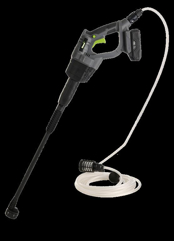 20V Li-Ion aku, laadija, pumba rõhk 24,5bar, veetarve 2L/min, pesuvahendi paak 400ml, 6m imuvoolik filtriga, tööaeg kuni 25min. 18127