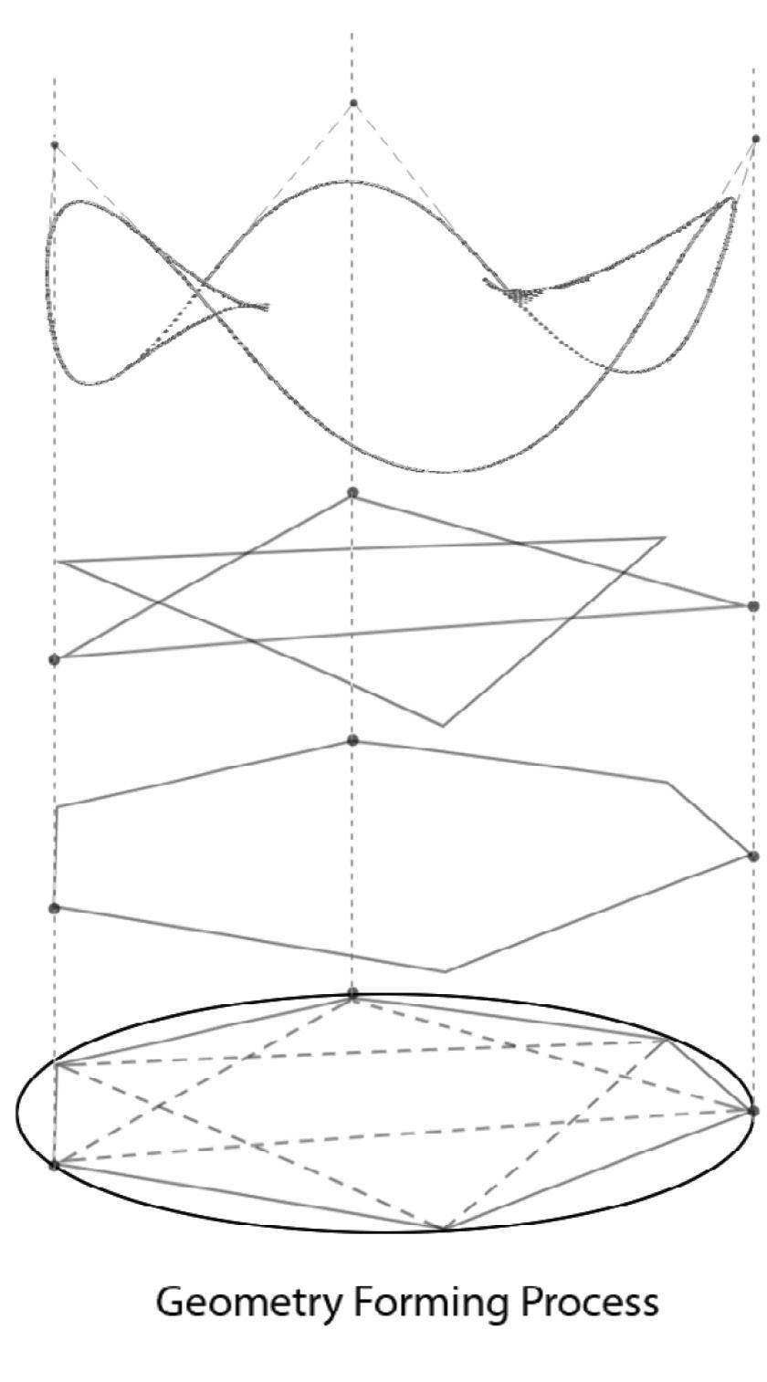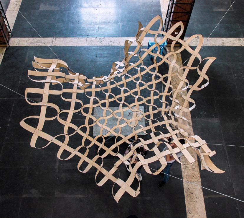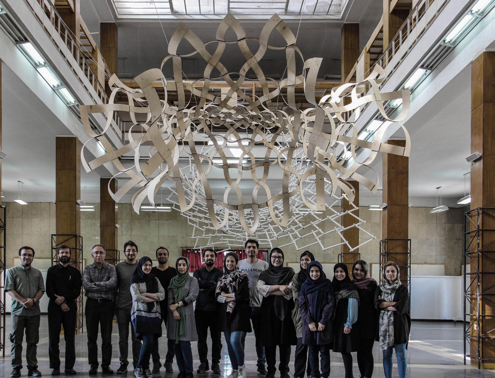 The Final product of this workshop is a pendant structure installed in the Exhibition Hall of the Faculty of Fine Arts of the University of Tehran. The structure is made up of a triangular module that forms a flat U with two 90 ° angles. By bending the two ends of the U, it bends the members to form a bended triangle. The flat structure is made of these triangles. Next, by enlarging some triangles, the students attempted to create a three-dimensional form. After understanding this structure’s behavior, we tried to create an algorithm in Grasshopper to simulate the final form in digital space and determine the dimensions of each fragment to reach the final form. The entire structure is mounted on six strings of cable that hang it.