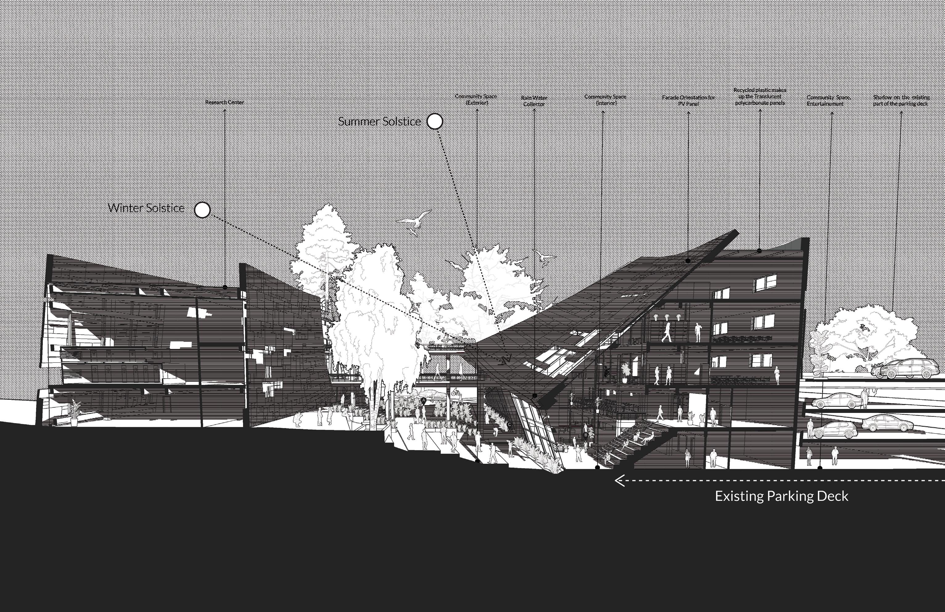Facade Opening is based on an attractor point in front of the community spaces to enhance connection between different groups of people from different majors to nature and create these moments of all sorts of connection.