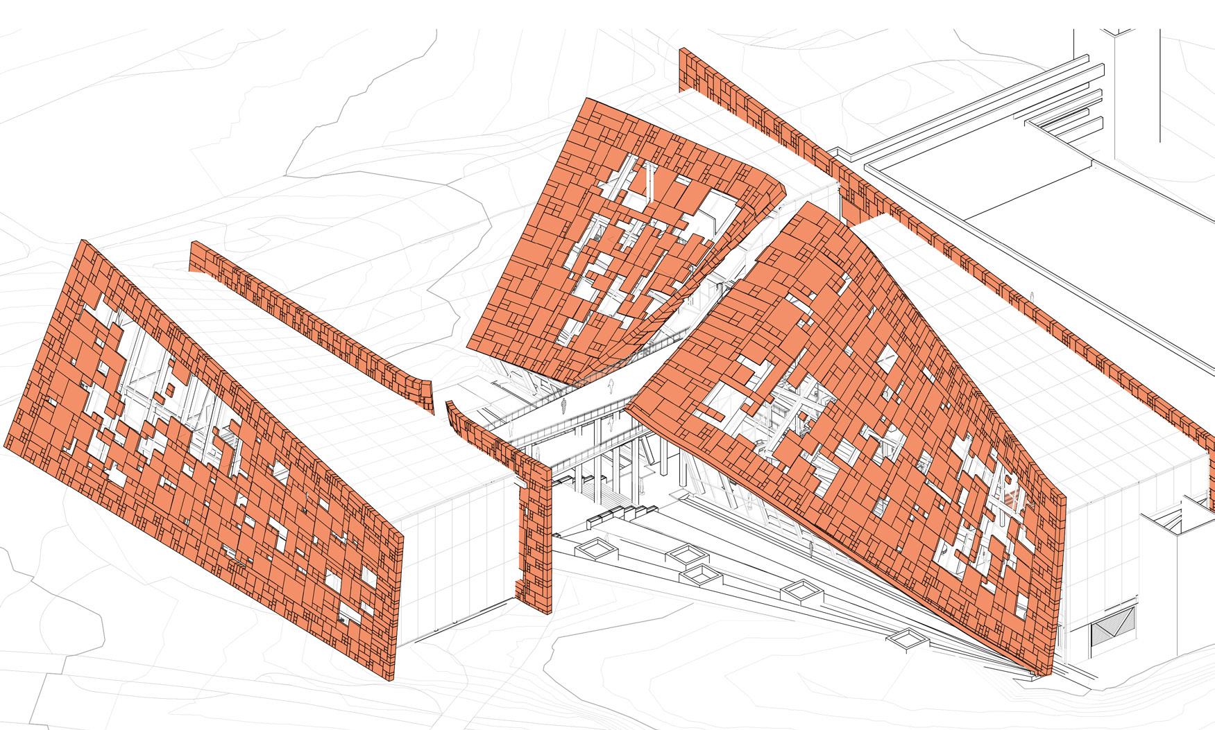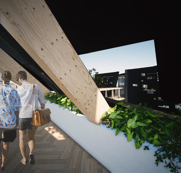 To preserve the connection between the massing, and parking deck toward the botanical garden, the main massing has been cut to highlight the main entrance and circulation in the building.