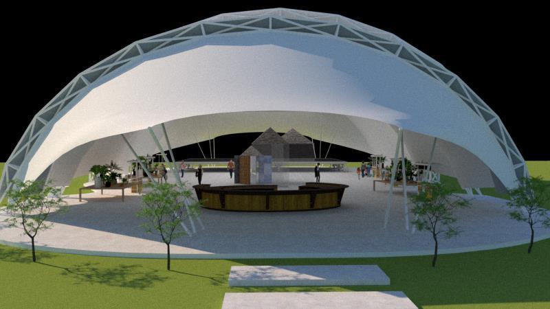 A 1452 sqm exhibition area. The analogy of this building is hermit crab, the shape of the membrane is like the shell and the front side is its head. The structure is using cable structure, portal, truss, and membrane. A place for flora and fauna exhibition that open for public and equipped with stage.