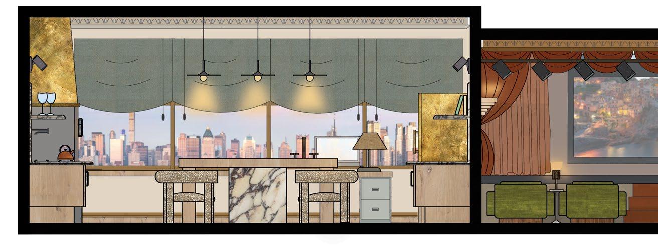 A CENTRAL CIRCULATION SPINE THAT CONNECTS THE PRIMARY SOCIAL SPACES—INCLUDING THE SALON, THEATRE, AND KITCHEN— ENCOURAGING VISIBILITY AND INTERACTION WHILE GUIDING RESIDENTS INTUITIVELY THROUGH THE BUILDING. THESE PUBLIC AREAS ANCHOR THE HEART OF THE RESIDENCE AND SUPPORT MOMENTS OF GATHERING, PERFORMANCE, AND SHARED ACTIVITY. SUPPORTING SPACES SUCH AS THE GLAM ROOM, ATELIER, POWDER ROOMS, AND LAUNDRY ARE POSITIONED IN THE BACK OF THE BUILDING TO OFFER VARYING DEGREES OF PRIVACY. THE ELEVATIONS AND SECTIONS FURTHER ARTICULATE HOW EACH SPACE IS EXPERIENCED VERTICALLY, REVEALING KEY INTERIOR MOMENTS SUCH AS THE THEATRE SEATING, THE GLAM ROOM P REPARATION AREAS, AND VIEWS TOWARD THE SURROUNDING CITY.