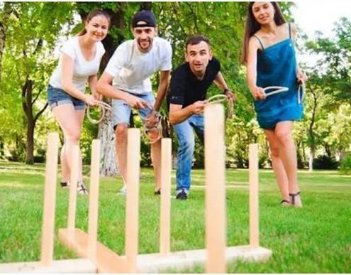 The traditional game of Quoits has a long and venerable history dating back to ancient Greece. This ancient game is easy to play, in basic terms rope hoops are thrown at the wooden pins to accumulate points, the player with the most points wins! This can be played by adults and children. Think tactically and try to outsmart your opponent!