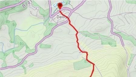 Route description: Stage 1: A ‘Dailly Trails’ board in the village square offers a large scale map of the route out of the village; follow the B741 east as it passes the church and curves right to reach a crossroad. Cross when safe and head up the surfaced minor road as indicated by the metal oak leaf path marker. This metal post will quickly become familiar as the walk progresses, representing the Colliers’ Oak where local mine owners used to meet with the Laird of Dalquharran. Continue up the road, gradually gaining height.