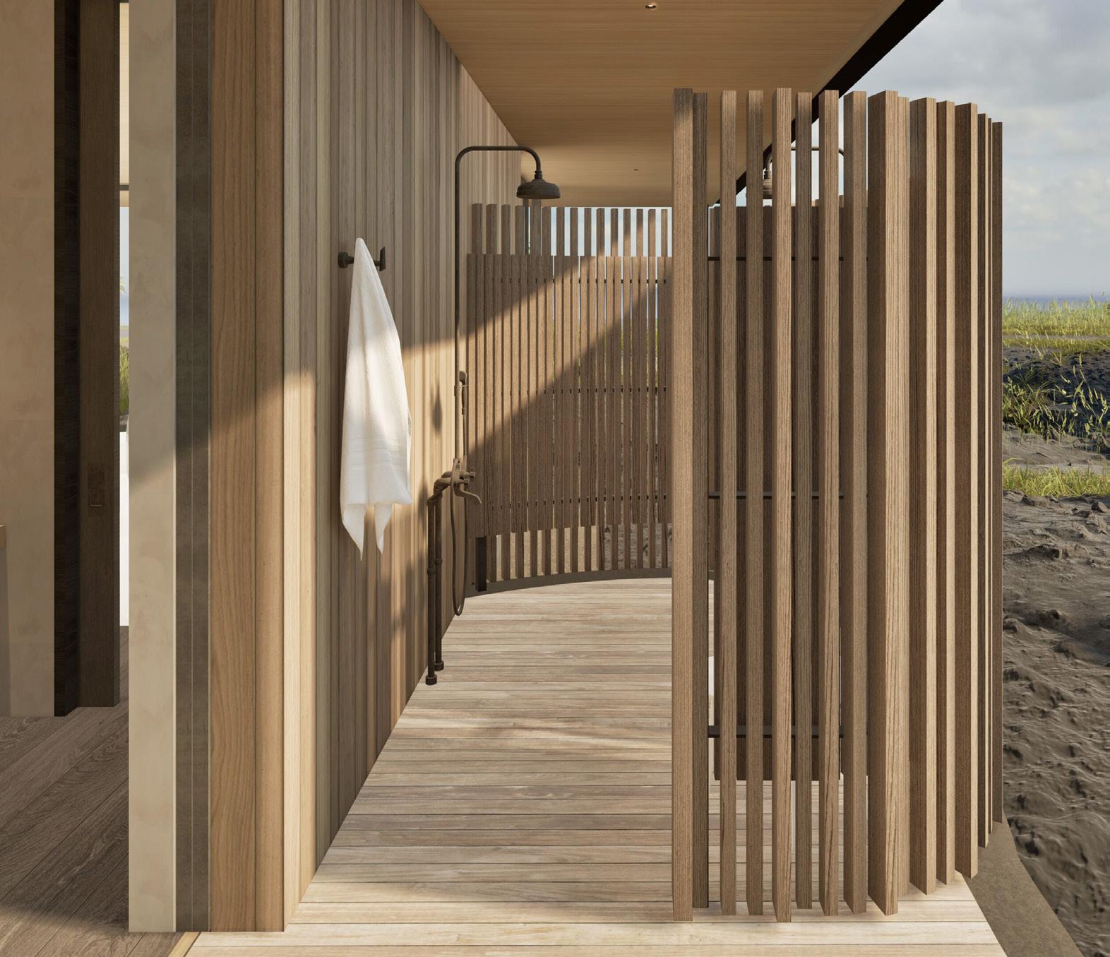 The materiality and detailing of the home are minimal and streamlined, without being too austere or self serious. For example, the wood siding is at random widths, the steel columns are lashed with rope, and the wood trellis overhangs and wood picket shower enclosures are randomly sized. These choices brought warmth to an otherwise disciplined material palette.
