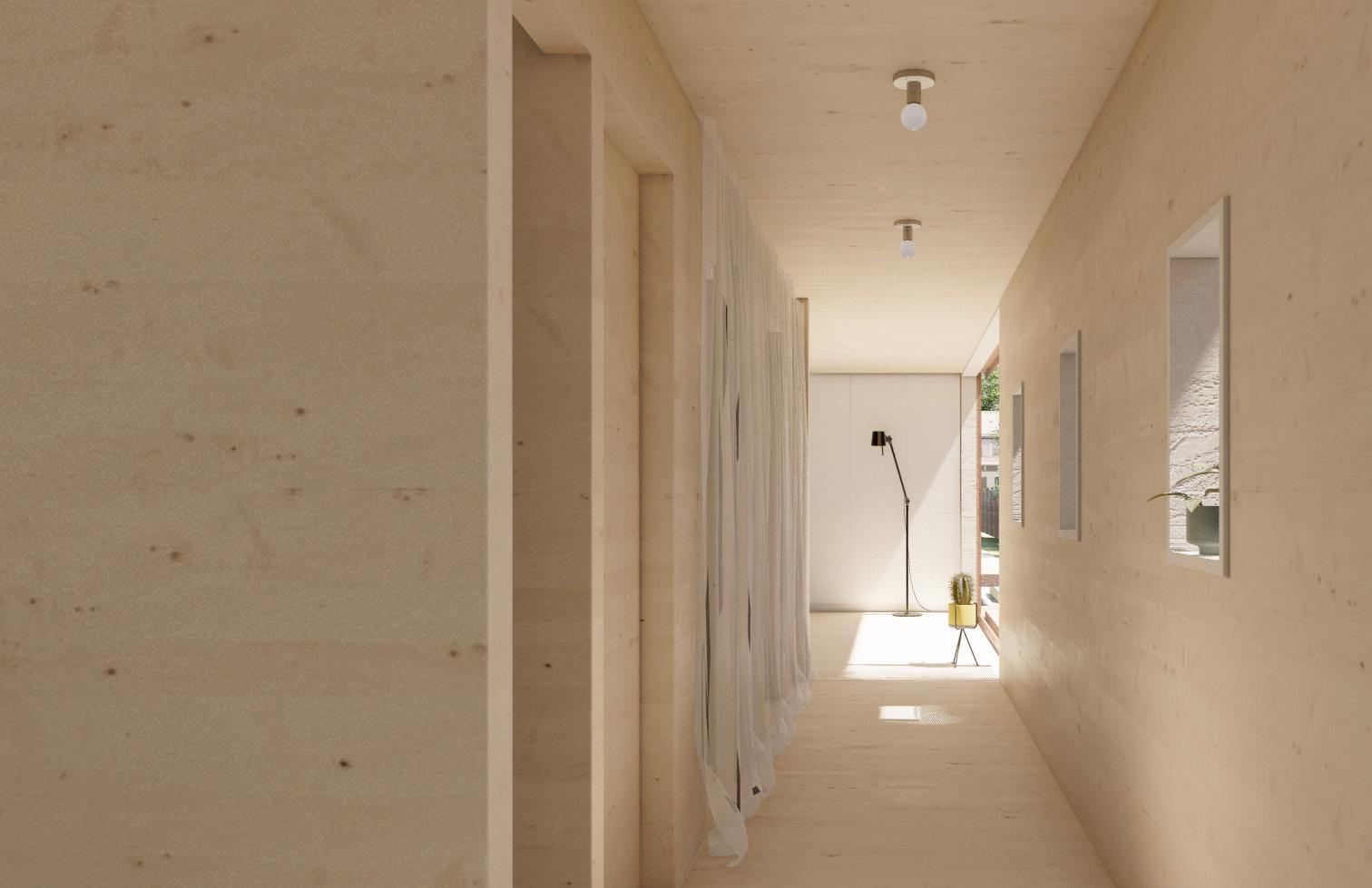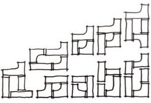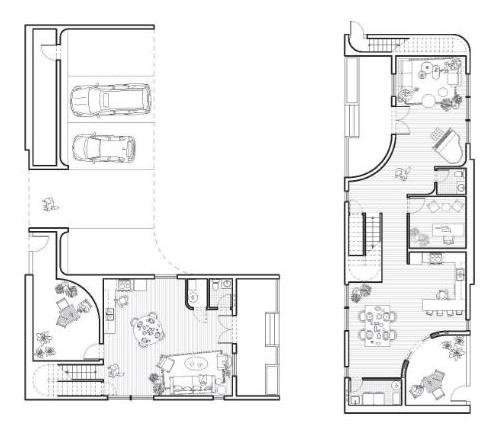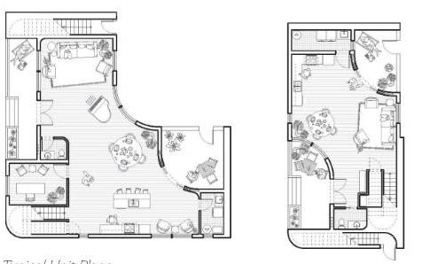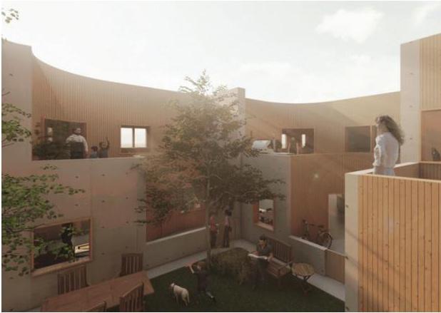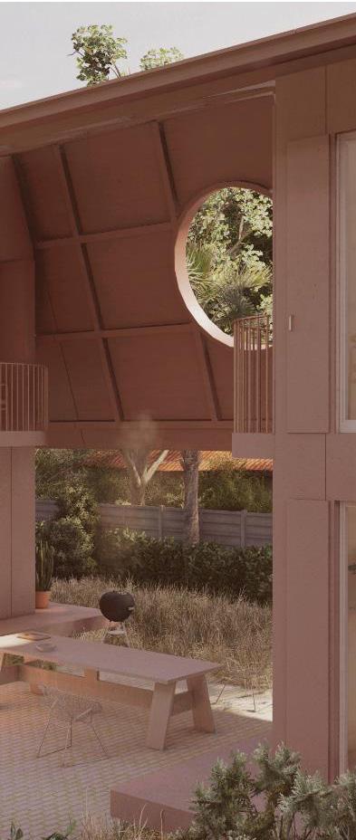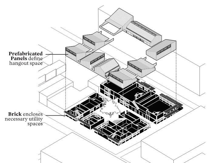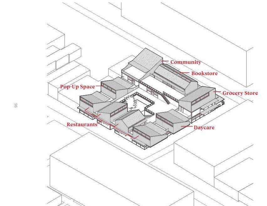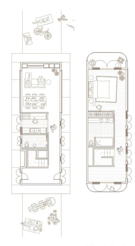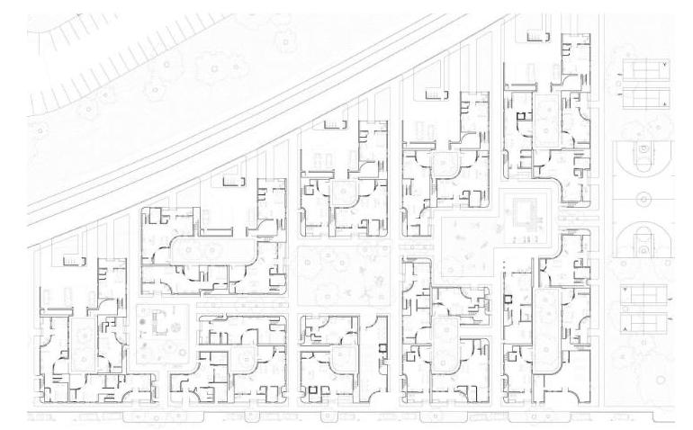 get out of it, like community spaces and resources. This middle ground between isolation and community was the starting point for our project. We designed distinct townhouses arranged in a tatami-mat formation creating courtyard between them.