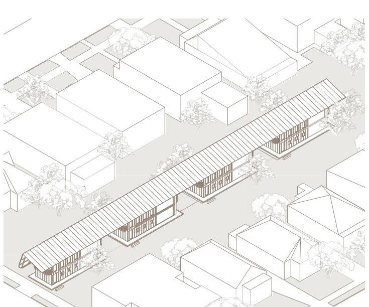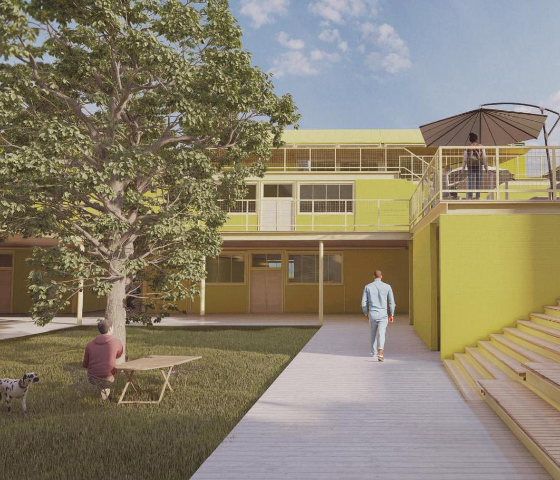 Parkplex had been strictly interiors, keeping the tired bungalow exterior intact. designed a new iteration of the project, modernizing the backyard structures, so that the backyard would feel entirely new and cohesive, while the three primary houses look completely different. We proposed this new design to the client and she loved it. Construction begins in June, with a target of completion a year out.