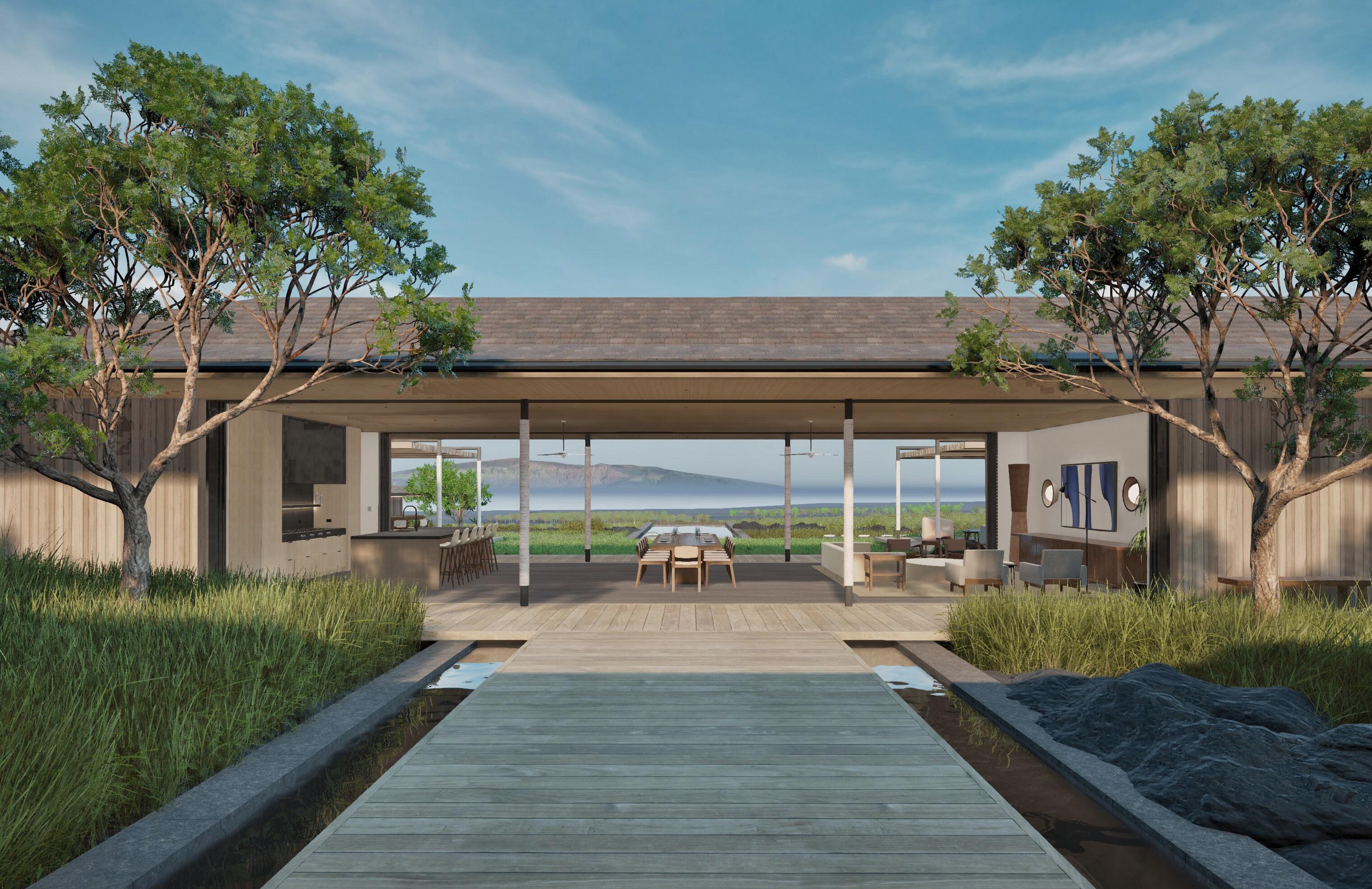 Though the site has a breathtaking view of Maui, it is obscured at the entrance by landscaping. Only after stepping into the entry lanai do you see a straight shot to Maui through the living room. This view is an axis that governs much of the project. The Main Hale is on axis with the view, with living spaces arranged perpendicular to maximize the locations where it is visible. The pool is also on axis with th view, and all of the guest hales are arranged to face the view while also responding to the existing grading.
