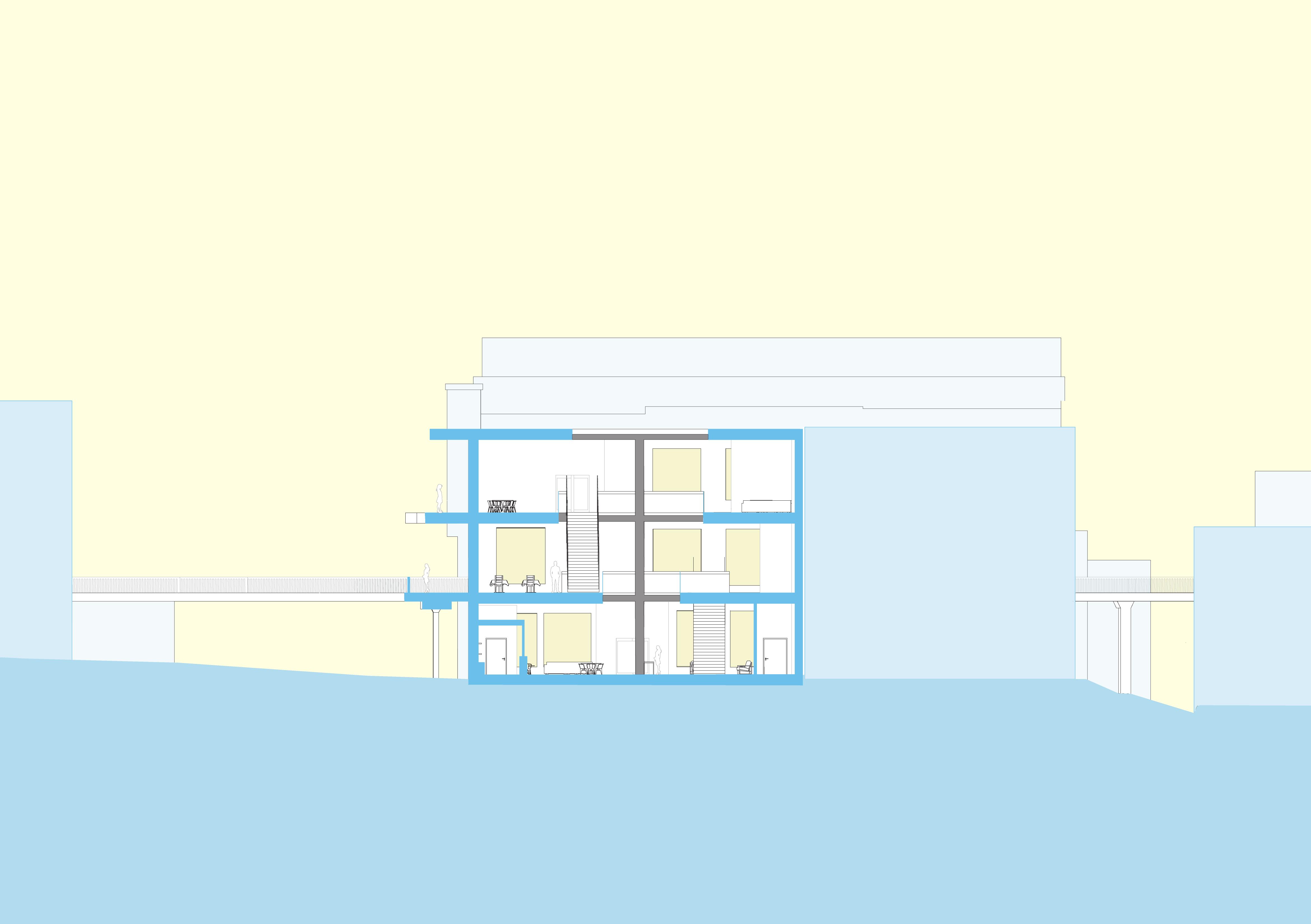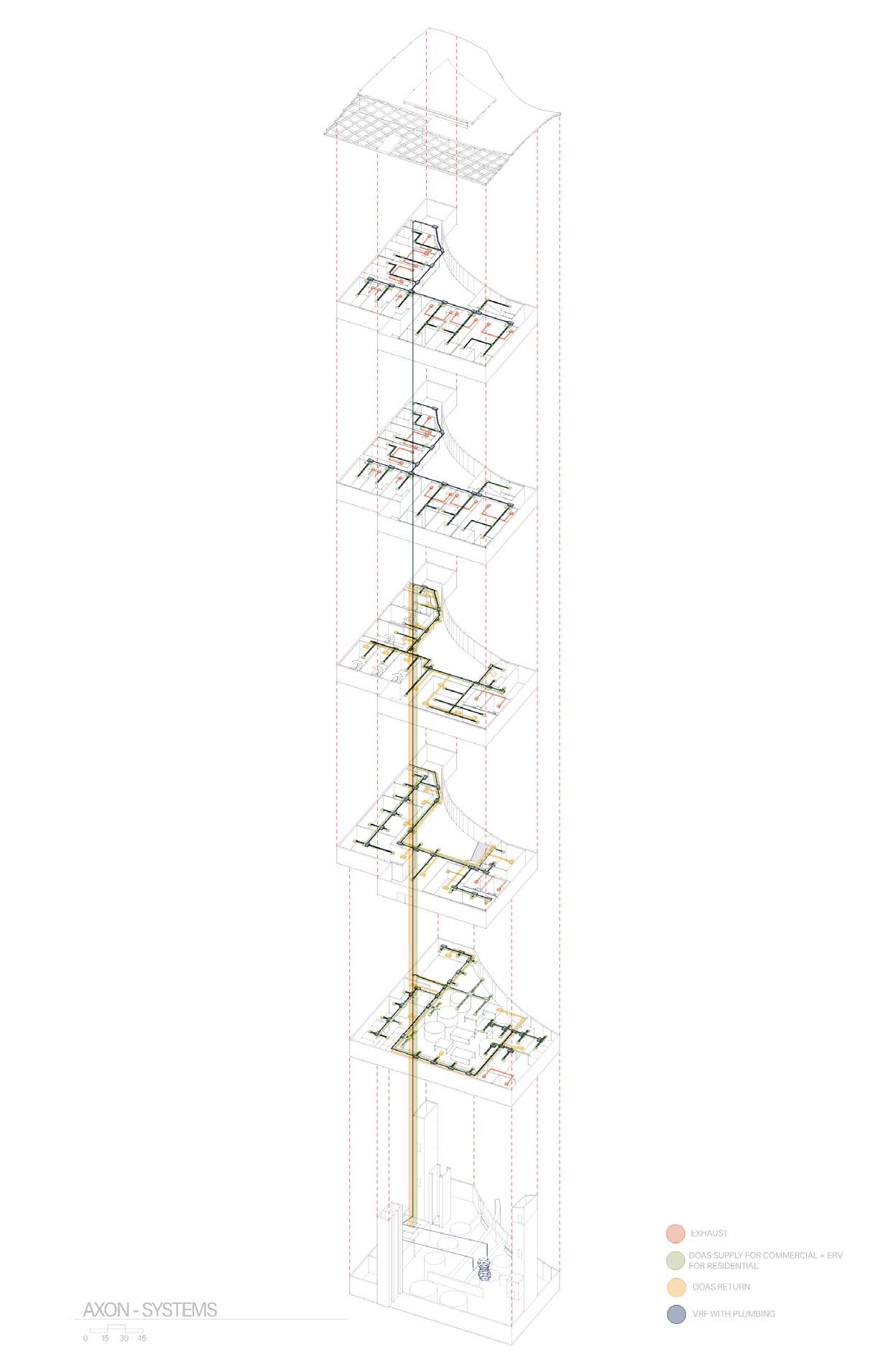 This project is located in Knoxville’s Old City, situated along First Creek, which flows into the Tennessee River. The design aims to utilize the creek as a resource for the building while simultaneously improving water quality in the surrounding environment. The building serves multiple purposes: the bottom two floors house a production facility and water treatment systems; the middle levels feature commercial and retail spaces for selling and promoting clothing; and the top two floors provide residential spaces for workers and artists. The project emphasizes the interconnected flows of water, people, and air, creating a harmonious balance between industrial, commercial, and residential functions.
