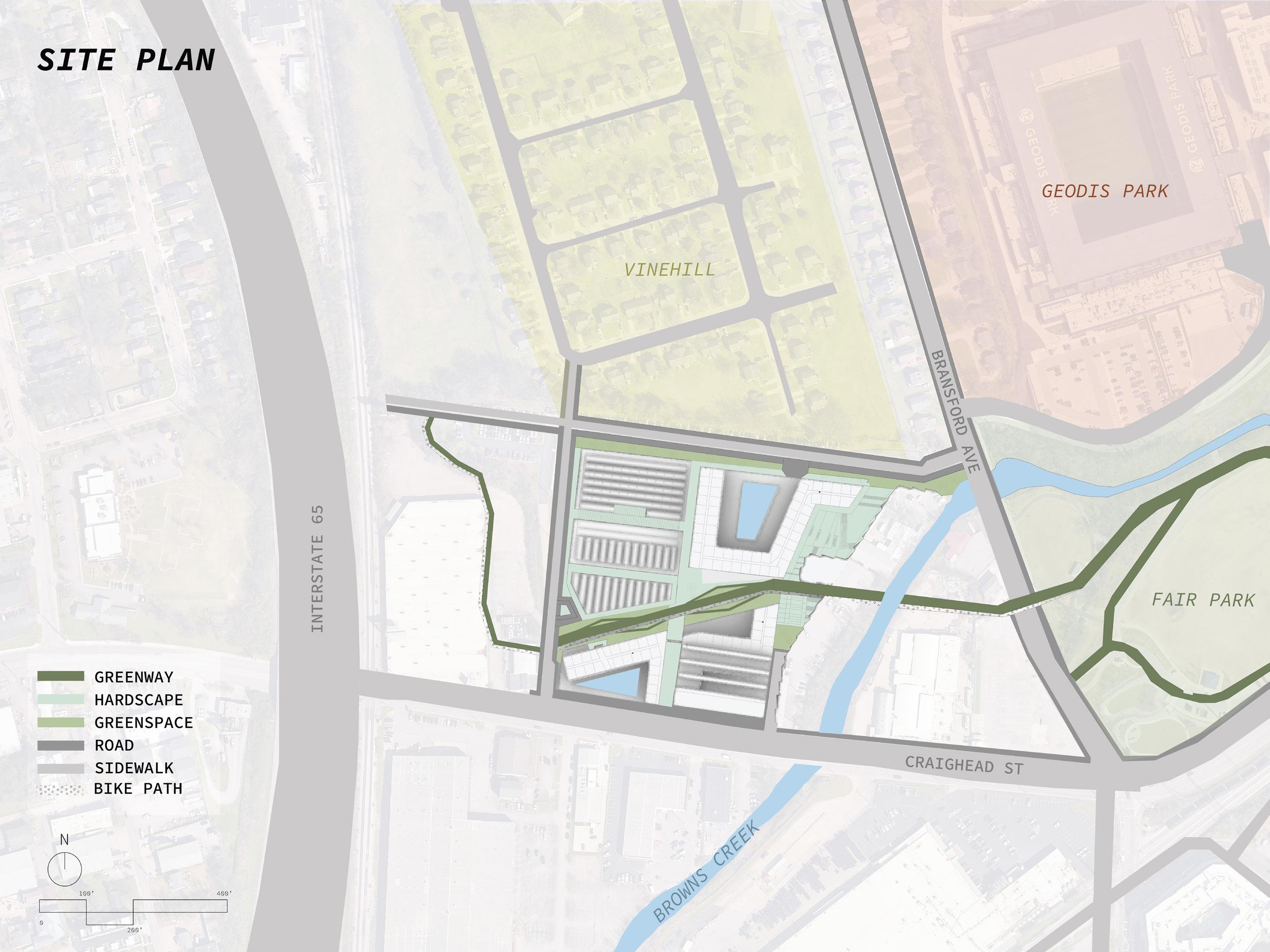 This project proposes a 40-acre transit-oriented development in Nashville’s Wedgewood-Houston (WEHO) neighborhood, near Geodis Park. Positioned between the stadium, a proposed rail-based transit center, and the Vine Hill neighborhood, the development aims to establish a vibrant, mixed-use district. Designed as a central hub, the project facilitates smooth connections between local and regional transit routes. The plan includes housing, restaurants, healthcare, entertainment, and other community resources—strategically integrating WEHO into the larger fabric of Nashville through accessible, transit-focused infrastructure.