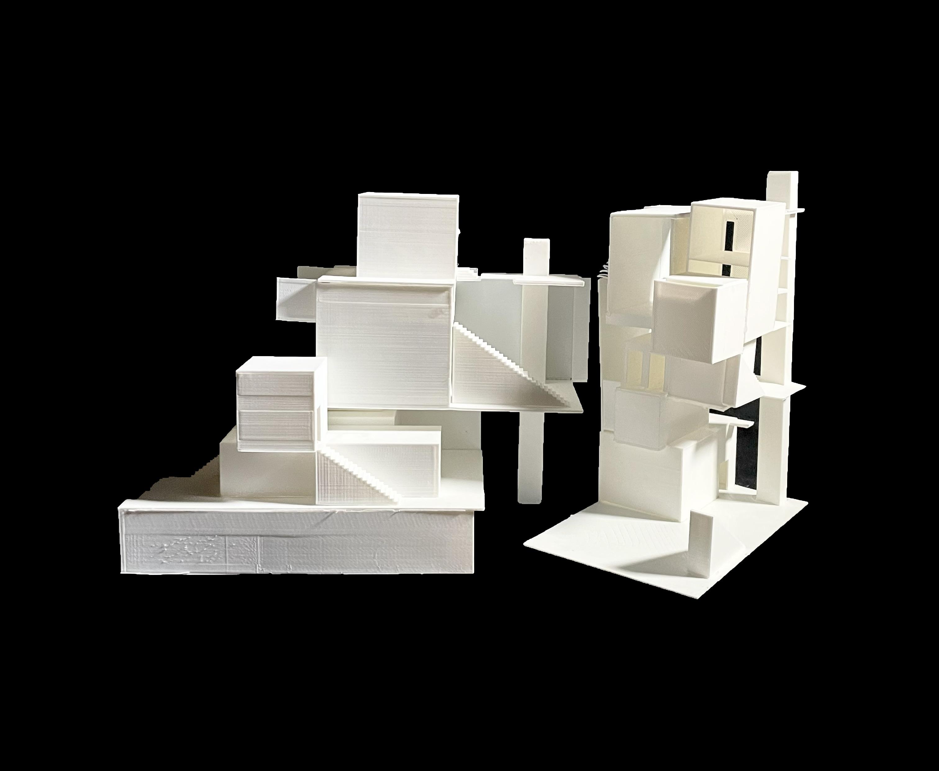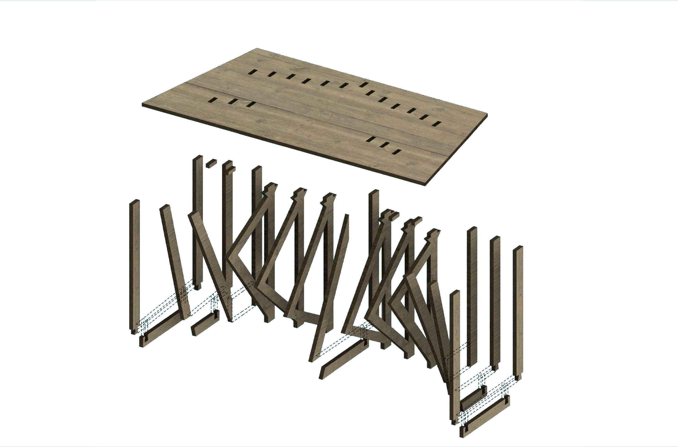 This project is a spatial construct designed to support a seamless “grab-and-go” dining experience. The design rethinks traditional meal spaces by catering to busy, high-traffic areas such as the 2nd-floor bridge overlooking the Ewing Gallery. Positioned at the edge of circulation, the construct provides a place to pause, set down a meal, and engage with others while also serving as a sculptural endpoint to the bridge. Its repetitive frames support the horizontal surface, creating a sense of motion in their incrementally adjusted configurations, while exposed joints highlight the design’s construction logic. When not serving its intended purpose, the piece adapts as a casual dining table, balancing functionality, movement, and visual interest in one cohesive design.