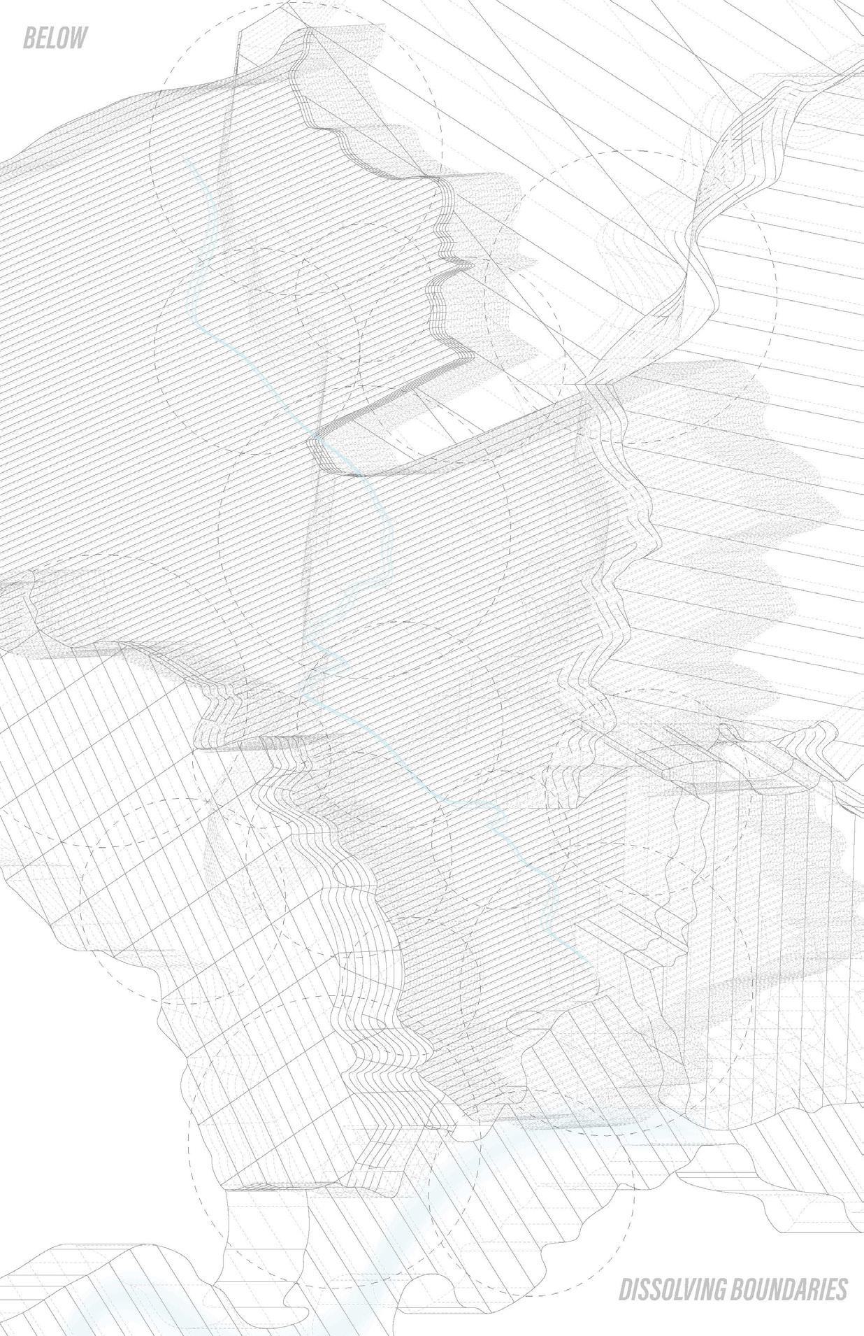 The below realm focused on mapping First Creek, a polluted and channelized stream, using geological and hydrological research to frame water as a transformative force. Site visits revealed layered, decaying conditions that were translated into physical and digital models, curved wax forms emphasizing flow, layering, and circulation. The `movement, below uncovering geological and hydrological layers, and between linking them through program flow and porous boundaries. Together, they form a unified framework where nature, architecture, and people coexist fluidly.
