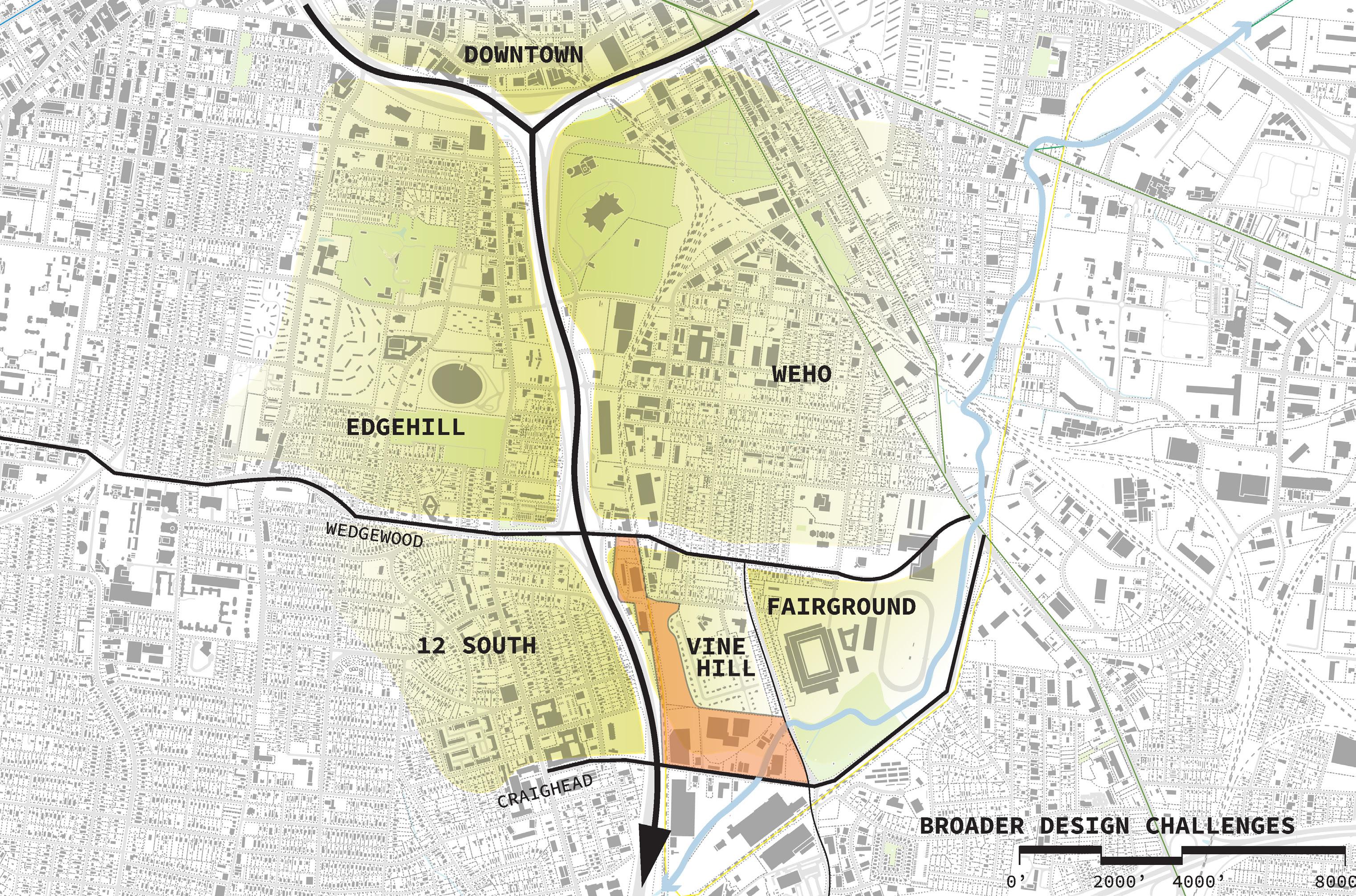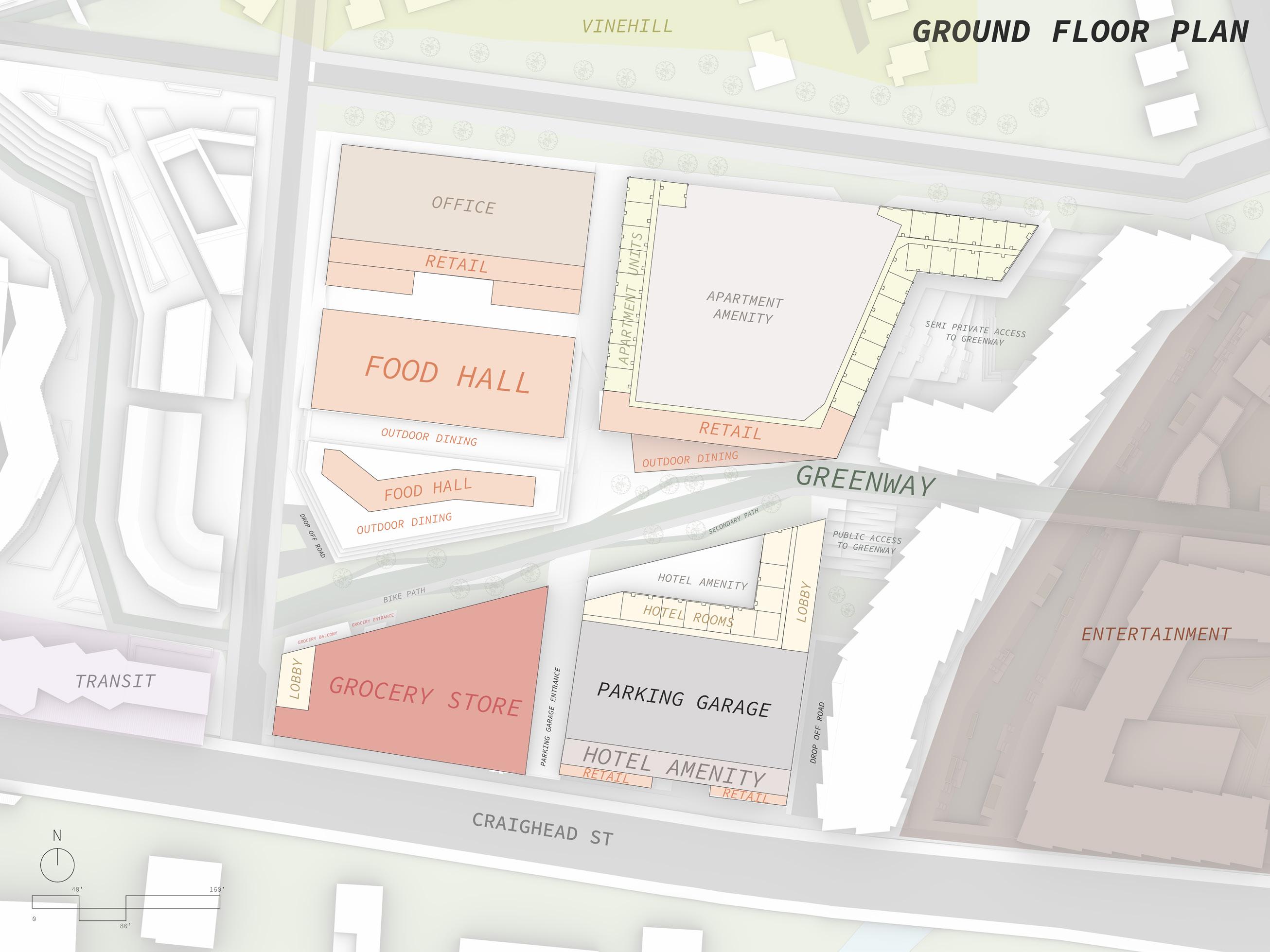 Each team member was responsible for a specific section of the large-scale transitoriented development proposal. This section served as the bridge between the entertainment district, the proposed transit center, and the existing Vine Hill neighborhood, ensuring strong physical and programmatic connections among these areas.