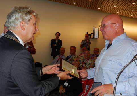 Na de speech van burgemeester Van der Laan op de Landelijke Gildedag, werd de onlangs afgetreden voorzitter Wim van Oosten naar voren geroepen, waarna Wim de gouden Gildespeld door de burgervader werd opgespeld, daarbij geassisteerd door de voorzit ter van Gilde Nederland, Henk de Kort. Tevens kreeg Wim de bij behorende oorkonde. Wim ontving de onderschei ding niet alleen vanwege zijn vele verdiensten voor Gilde Nederland, maar ook voor de enorme wijze waarop hij zich heeft ingezet. Wim was zichtbaar geroerd door deze huldiging en alle belangstelling.