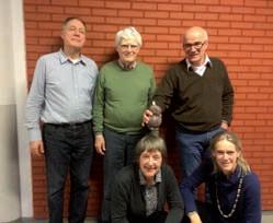 Aansluitend aan de bestuursvergadering van vrijdag 2 oktober, werd er officieel afscheid genomen van de voormalige bestuursleden Els van Overbruggen, Willem Koole en Wim van Oosten. Voor deze gelegenheid was het trio speciaal naar Utrecht afgereisd, waar, voorafgaand aan het afsluitende dineetje geheel in stijl een heuse stadswandeling was ingepland. Martin Brand was voor deze speciale gelegenheid de gids, die het kleine gezelschap de vaak nog onbekende plekjes, aspecten en rijke hisorie in het centrum van de aartsbisschoppelijke stad, op een uitermate verhelderende wijze aanschouwelijk maakte. Na de korte doch stevige wandeling het etentje, waarbij de afscheidnemers door voorzitter Henk de Kort nog eens uitvoerig bedankt werden voor hun inzet en een speciaal voor hen uitgezocht boek ontvingen.