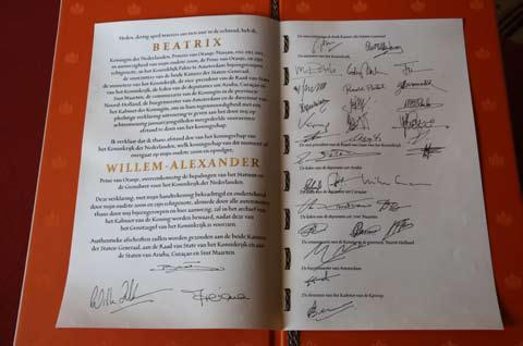 abdicatie na ondertekening door Koningin Beatrix en haar opvolger ook door alle leden van kabinet getekend moest worden. Dat deden ze met speciale vulpennen die op het juiste moment gebruiksklaar dienden te zijn. Ze moesten minutenlang in beweging worden gehouden zodat de inkt er gemakkelijk uit kon vloeien. Vervolgens moest het belangrijke document buiten het beeld van de camera’s om zo