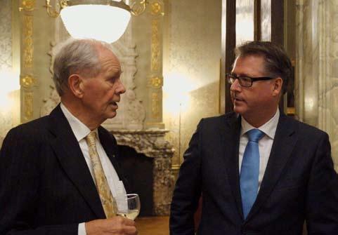 In het Kabinet van de Koning kom je niet zo gemakkelijk binnen en zeker niet met zo’n grote groep, maar is men eenmaal binnen, dan wacht een gast vrij onthaal. In ons geval werden wij welkom geheten door Nico Hok, me dewerker binnen het Kabinet. Hij had al heel wat keren onze gidsen tijdens een stadswandeling langs zien lopen om stil te houden bij de monumentale entree. Zijn idee ons uit te nodigen was in goede aarde gevallen bij drs. F.J.J. Princen, plaatsvervangend directeur van het Kabinet, die ons vervolgens begroette en meenam naar de hoog ste verdieping om een presentatie te geven van hoe deze kleine rijksorgani satie (28 fte) de Koning ondersteunt in de uitoefening van zijn constitutionele werkzaamheden.