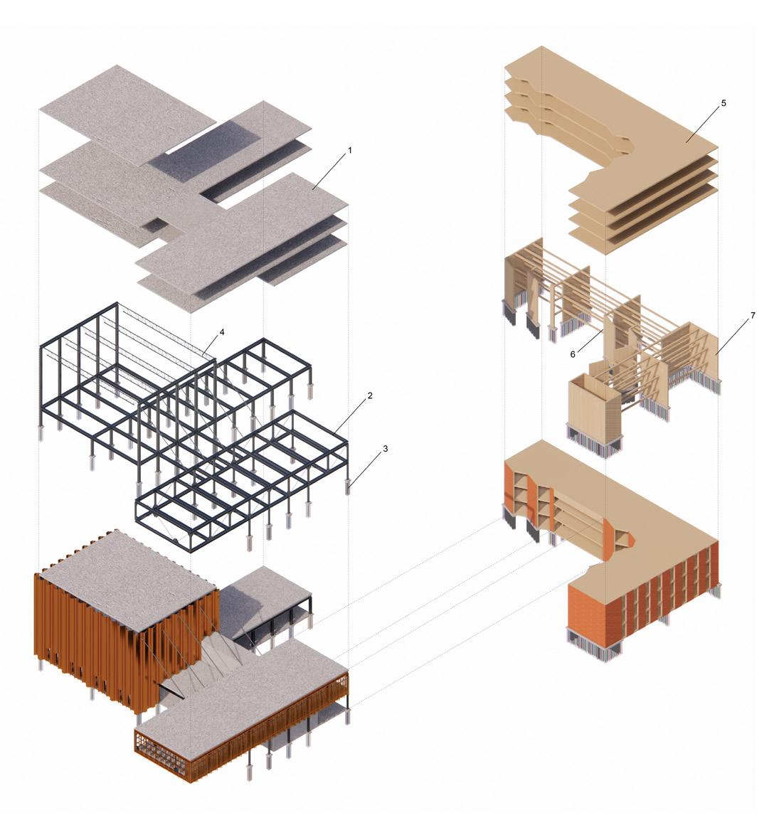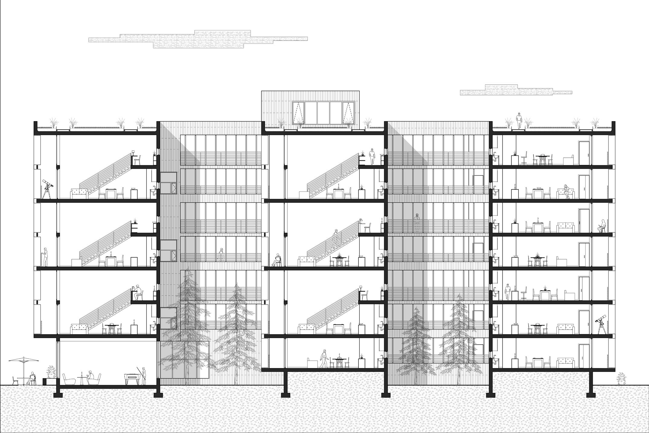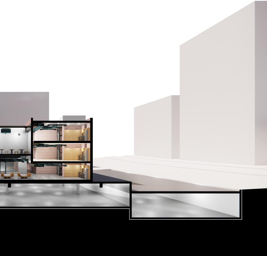 Section perspective cutting through classroom building, dormitory building, and underground parking garage