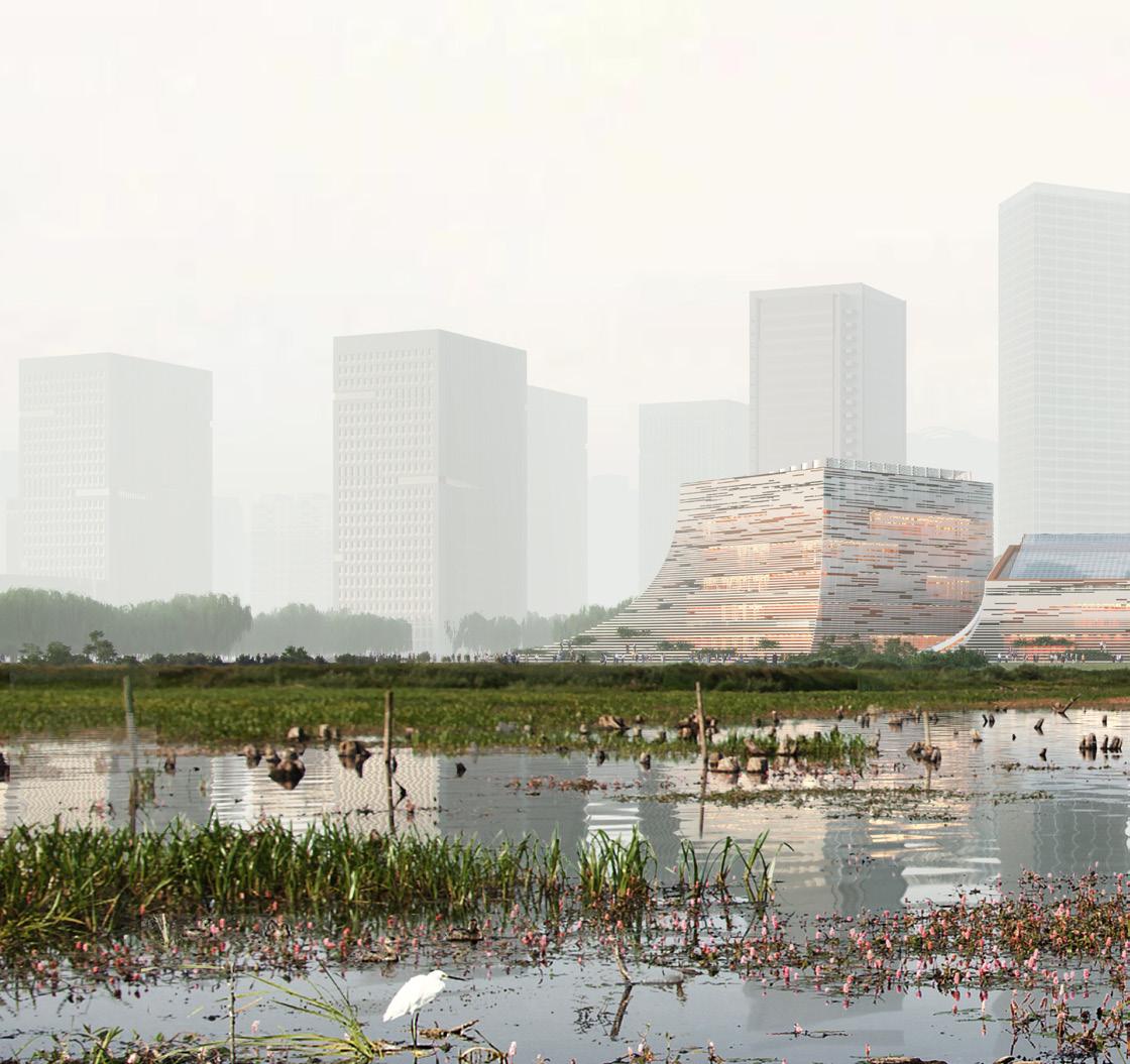 Exterior rendering of expected northwest view from Zhangcun River, provided by Cook Haffner Architecture