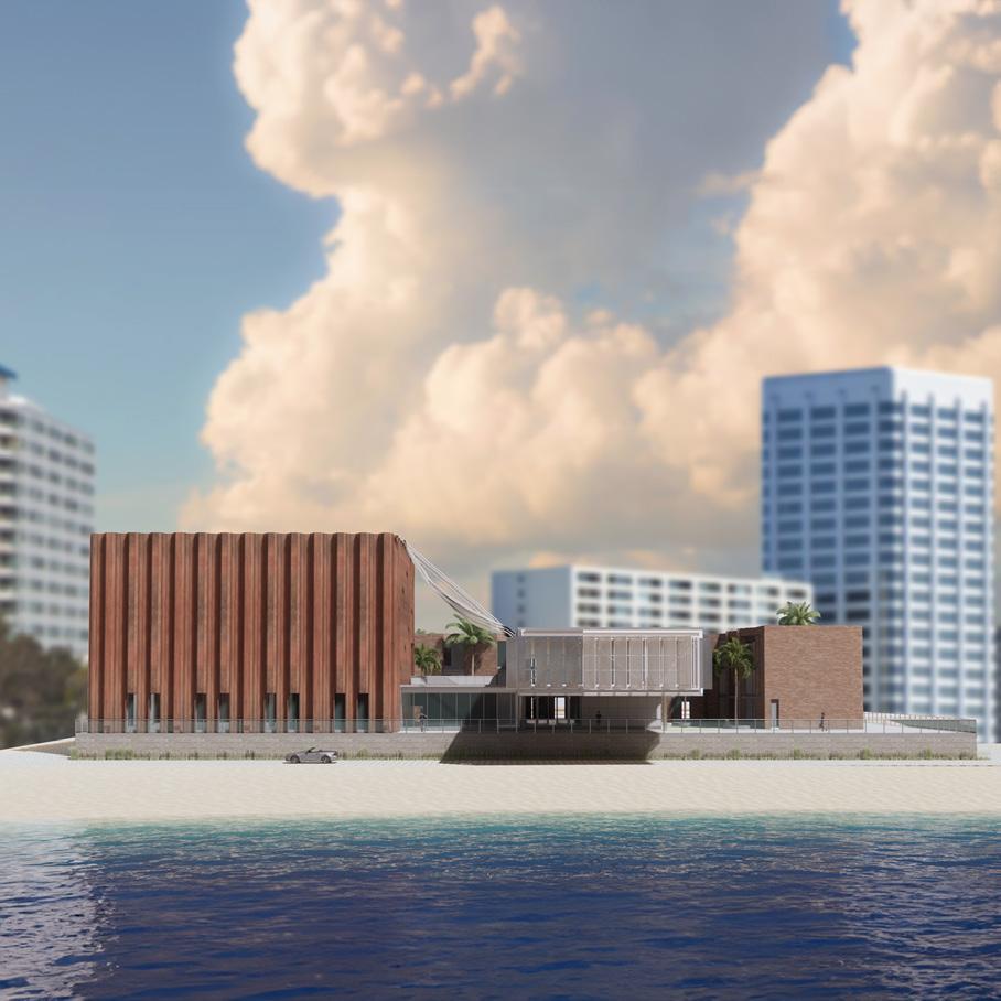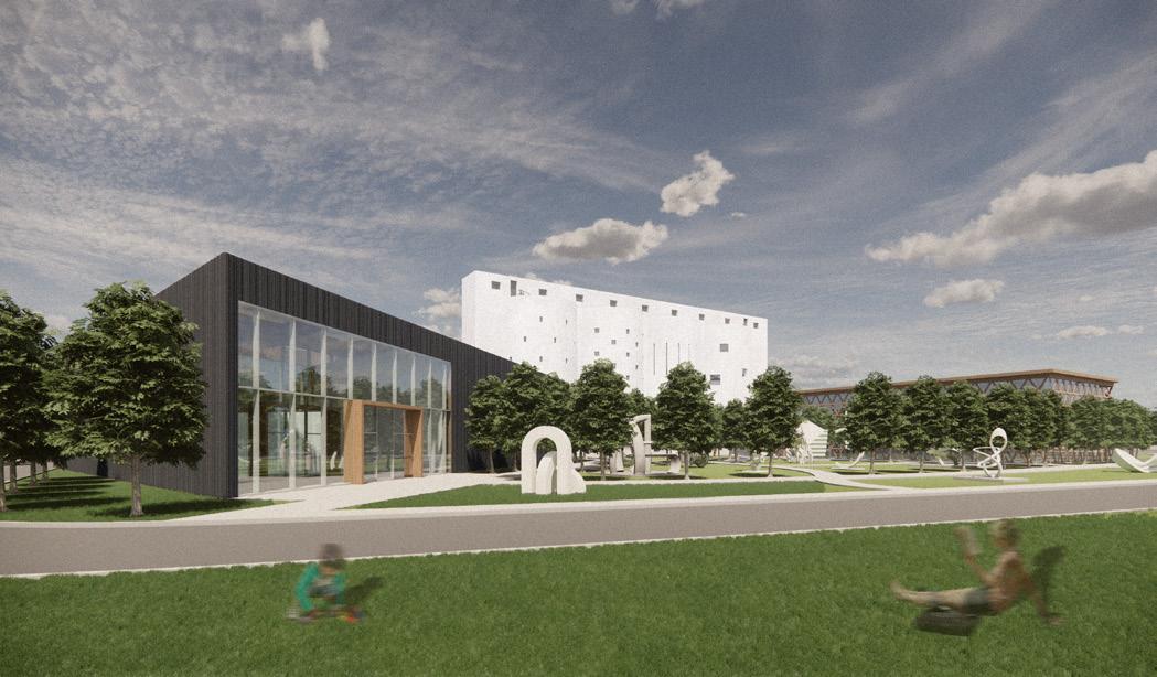 Exterior rendering of south facade, including art gallery, silo gallery, sculpture garden, and visitor center.