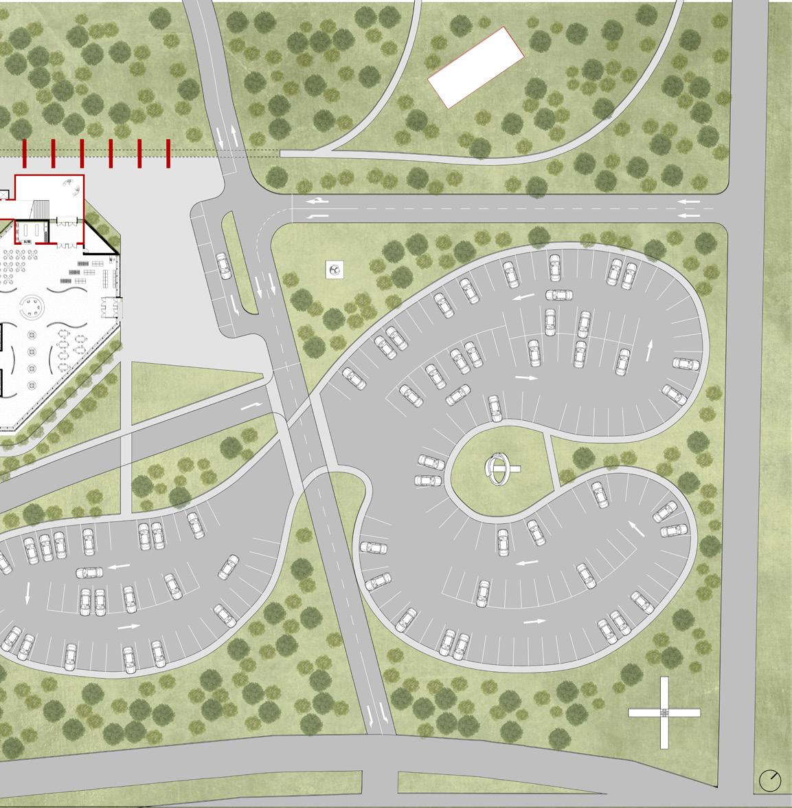 The existing silos on the site shows in red will be renovated to exhibit the replicates of Bob Cassilly’s work. The new visitor center and gallery will hug the silos from two ends, creating an avoid in between. This avoided space becomes a sculpture garden, exhibits the works of local sculptuors. The northeast corner of the site will be a new parking lot, the shape was designed in an artistic way on purpose.