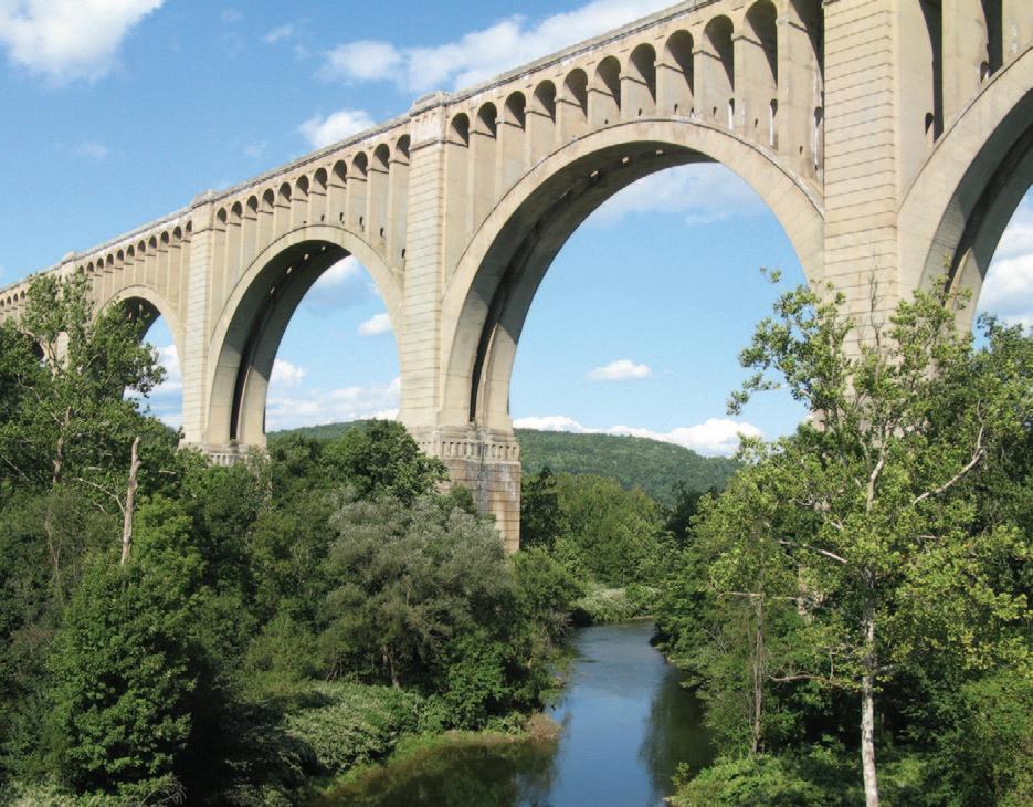 and activities of the 38-mile D&H Rail Trail. The trail stretches from Simpson, PA north to the New York state line passing through the small towns of Vandling, Forest City, Union Dale, Herrick Center, Burnwood, Ararat, Thompson, Stevens Point and Lanesboro. Points of interest include the Lackawanna River, Stillwater Dam and the Starruca Viaduct– a Bluestone structure built in in 1848. It is the oldest railroad bridge still in operation today.