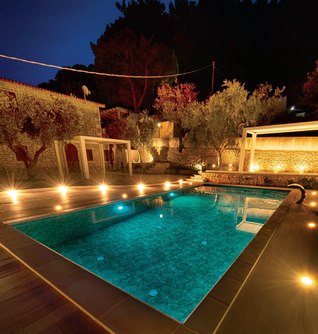 Foto di copertina: piscina ad uso privato, con sfioro infinity su un lato lungo, dimensioni mt 3,50 x mt 17,40 x h.1,40, rivestimento interno in travertino.