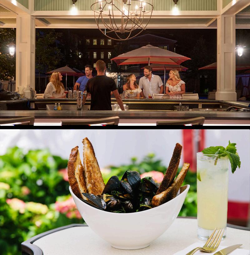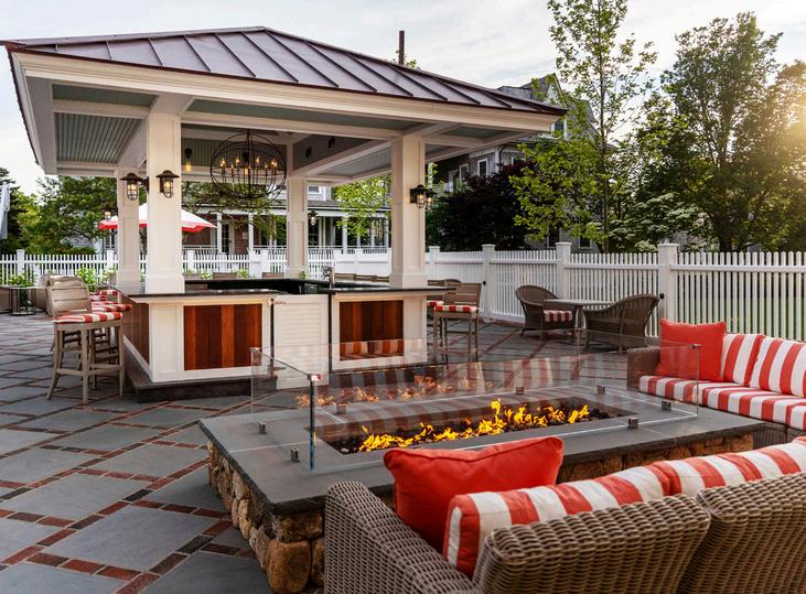 Sprinkled with coral and white pillows, umbrellas, cushy chairs and fire pits on a brick and blue stone patio, the Roxy Pool Bar is a tranquil place for residences and guest to enjoy a meal or drink al fresco.Set right by the pool and a dazzling landscaped garden, during the season, the Roxy Pool Bar offers a casual all- day menu with wonderfully refreshing summer cocktails