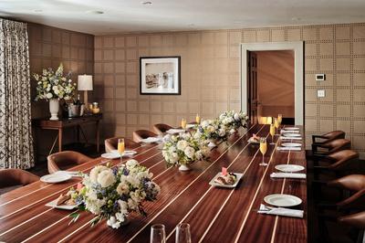 An elegant private dining and conference space. Decorated with an impressive, custombuilt, wood table that can be combined into one long, dining room table or conference table. For conferences, the Chilmark Room is equipped with a retractable screen for audio visual presentations.
