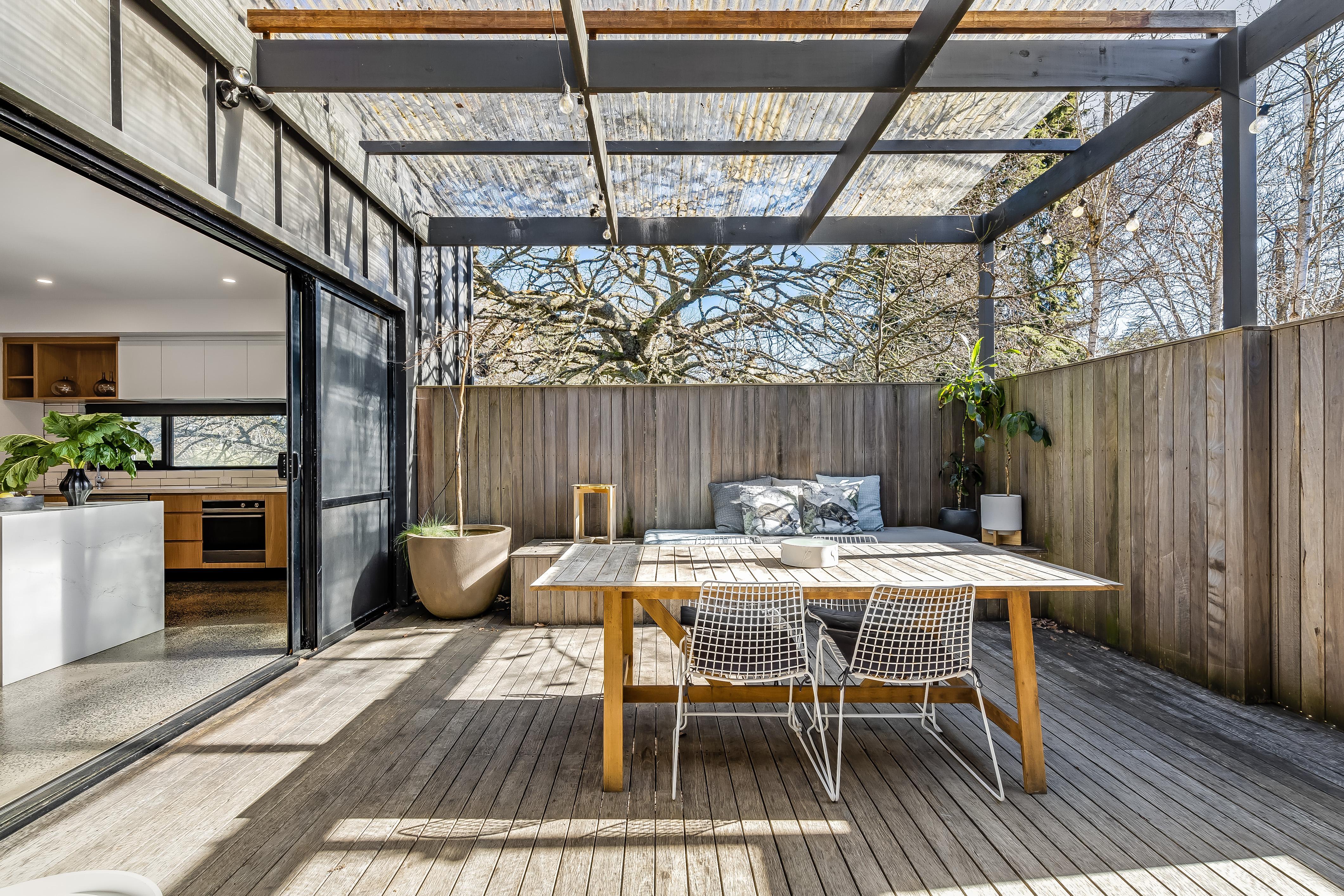 Attherearofthehomethere'sanorthwestorientatedterracedand retained,privatepavedcourtyardgardenwhereanautomatic retractablecafeawingextendingfromthehomeprovidesshadeand shelterfromtheelementsandagardengatewhichleadstothe doublelockupgaragejustafewstepsaway.