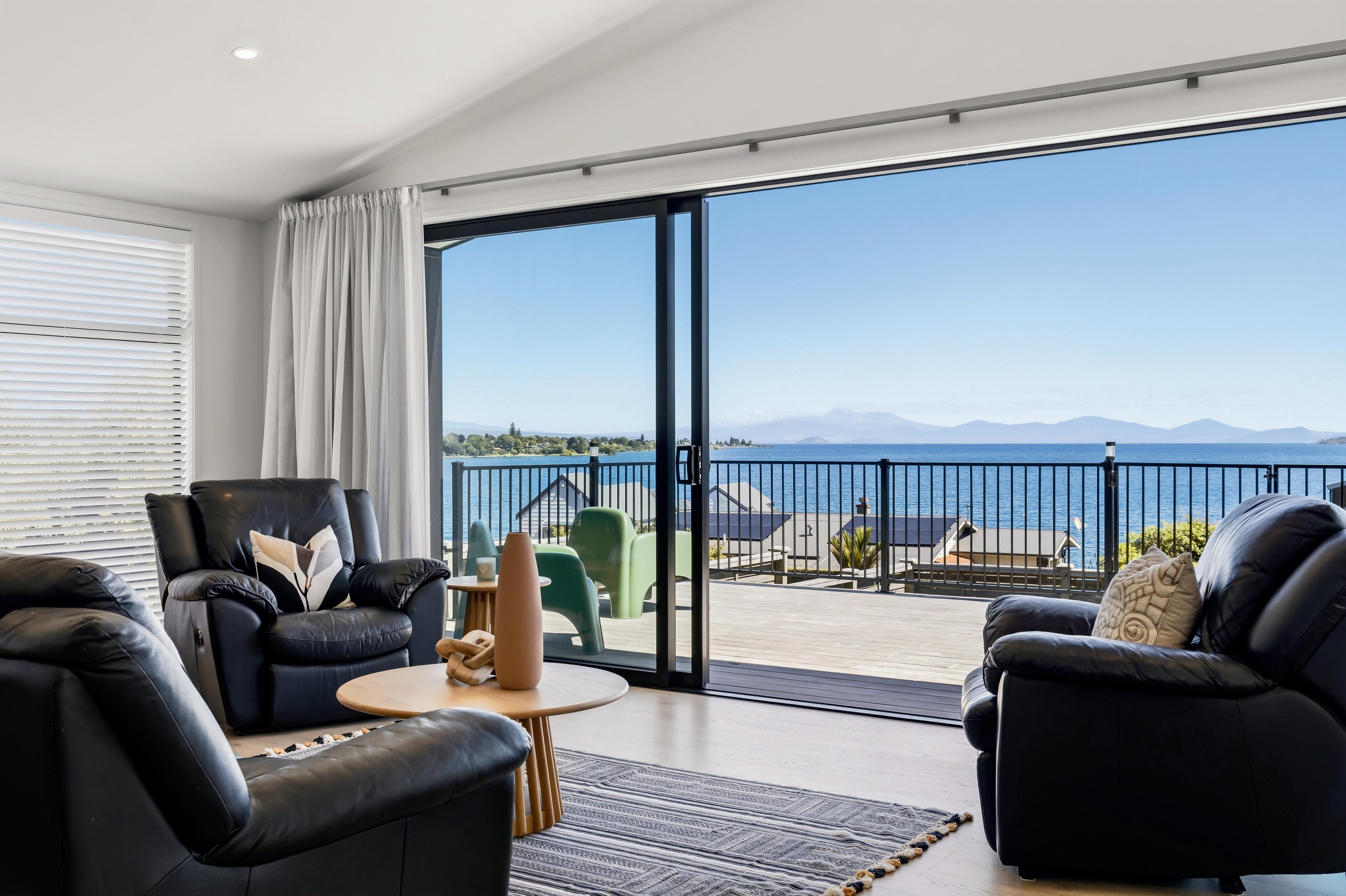 This contemporary 2023Mbuilt residence captures the essence of premium Taupo living, offering sweeping lake views and an elegant, light filled interior. The open plan living area has been thoughtfully designed to maximize the outlook, flowing seamlessly to a spacious outdoor deck perfect for hosting guests or enjoying quiet evenings overlooking the water. Steps lead down to a garden, creating a private sanctuary that complements the homeAs elevated position.
