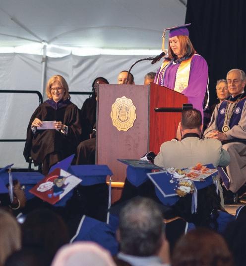 A MOMENTOUS OCCASION unfolded on May 11: the 108th Commencement Ceremony. More than 200 graduates, donned in caps and gowns, celebrated on the Great Lawn of the Academic Center. President Jon Jay DeTemple shared the community's immense pride, stating, "You did it. You crossed the finish line," in recognition of the graduates' perseverance and dedication. Shannon Montgomery was awarded the prestigious President’s Award for her outstanding contributions to academic support and community outreach. Nadine Nabil (pictured right, middle) eahhrned the Student Leadership Award for her service and leadership, while Lily Yach and Teaghan Fredericks (pictured right, top, delivering the student address) both received the Harcum Award, presented to the most well-rounded students in both academic and co-curricular pursuits.