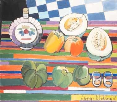 Gemäß dem lateinischen Motto memento mori , ist sich Herma Körding der Vergänglichkeit des eigenen Lebens bewusst und setzt den Prozess der Verwandlung von der Blüte bis zum Verwelken, von der Reife bis zum Verfall, vom Sein bis zum Vergehen malerisch in ihren Stillleben um. Früchte wie Äpfel, Feigen oder Zitronen, Lebensmittel, wie Fische, Kürbisse oder Muscheln, Pflanzen und ihre Blüten sowie Krüge und Vasen – all diese Bestandteile des alltäglichen Lebens stehen sinnbildlich für die Vergänglichkeit eines Augenblickes. Körding nimmt sie als Vorlage, teilweise als Mitbringsel von Ihren Reisen, und arrangiert sie in ihrem heimischen Atelier zu harmonischen Kompositionen. Während die Stillleben aus den frühen 1960er Jahren noch eine große, monochrome Flächigkeit aufweisen, auf der die Objekte komponiert wurden, systematisiert Körding die Werke der 1970er und 1980er Jahre mit geometrischen und ornamentalen Rastergründen. Neben den Ölbildern widmet sich Körding seit den 1980er Jahren dem Stillleben zudem in einer Serie von kolorierten Kohlezeichnungen, die bis zuletzt mit einer Intensität und Unmittelbarkeit den Prozess der Verwandlung darzustellen vermögen.