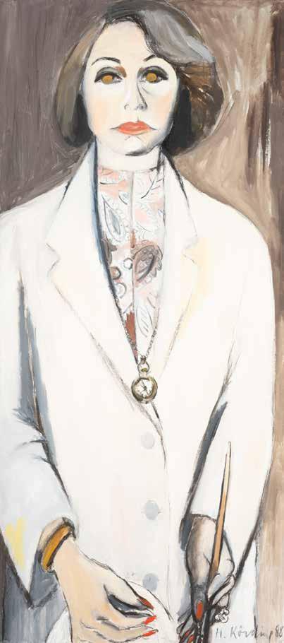 Das Selbstportrait aus dem Jahr 1988 (Abb. 50) zeigt Herma Körding mit goldfarbig leuchtenden Augen, frontal den Betrachtenden gegenüber positioniert. Gekleidet in einem weißen Malerkittel hält sie den Pinsel in ihrer linken Hand, verweisend auf ihre Profession. Wie bei den meisten ihrer Portraits wählte Körding ein schlankes Hochformat, das den Bildausschnitt stark eingrenzt und somit den Fokus ganz auf die dargestellte Person richtet. Die Taschenuhr, die mittig um ihren Hals hängt, verweist auf die bildnerische Auseinandersetzung mit dem Thema der Zeit, genauer der Vergänglichkeit, die ein wiederkehrendes Motiv in Herma Kördings Schaffen darstellt.