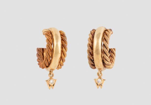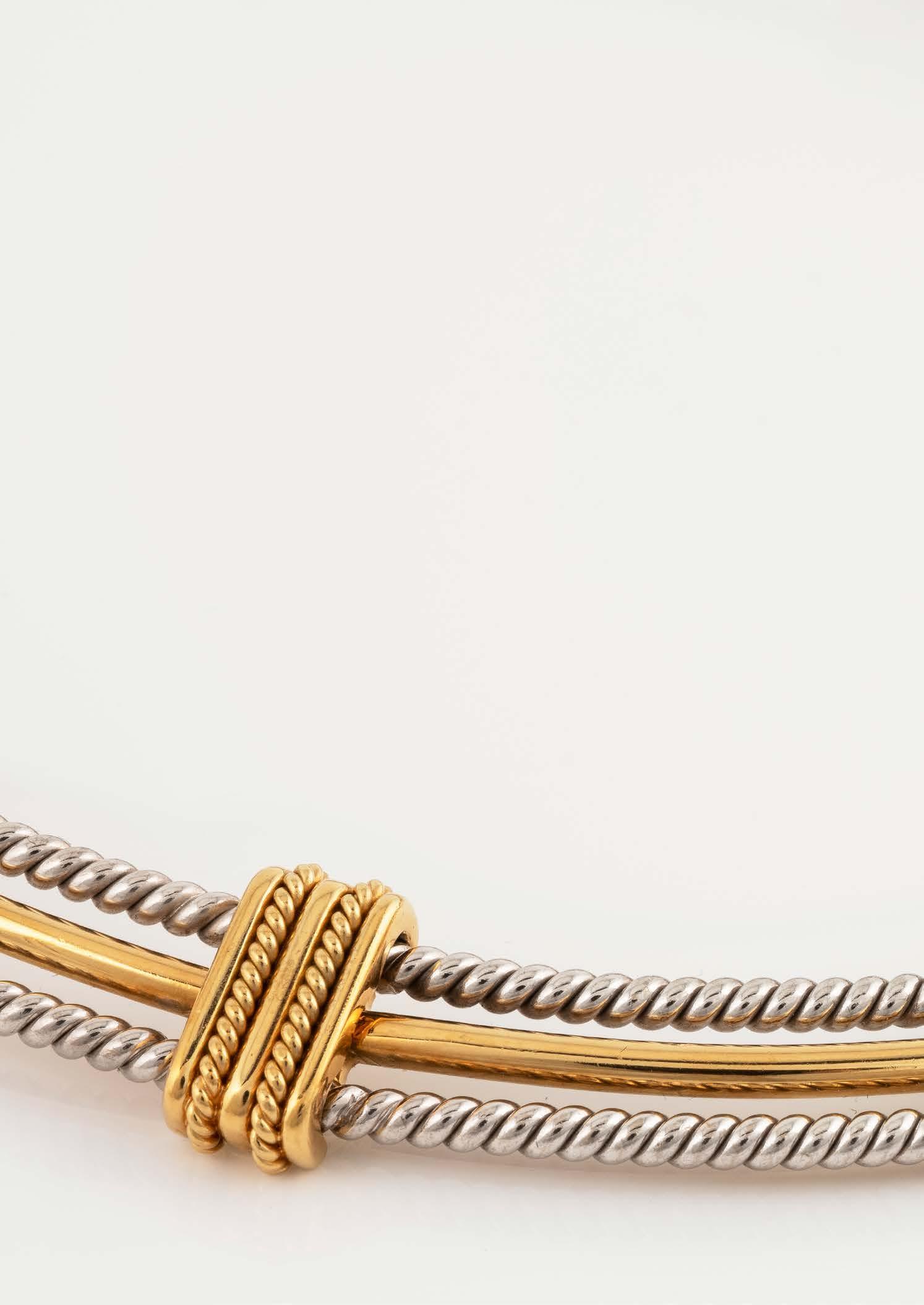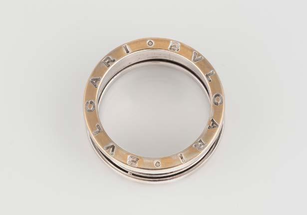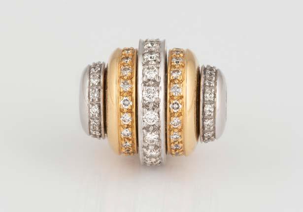 Gelbgold, Weißgold. Innenmaß ca. 6,1 x 5,2 cm, Ges.-Gew. ca. 45,9 g. Gest. 18 Kt, 750, italienische Punzierung für Mailand, Herstellersignet ‚M‘. 36 Brillanten, zusammen ca. 0,36 ct., flexibles Innenband wohl Metall.