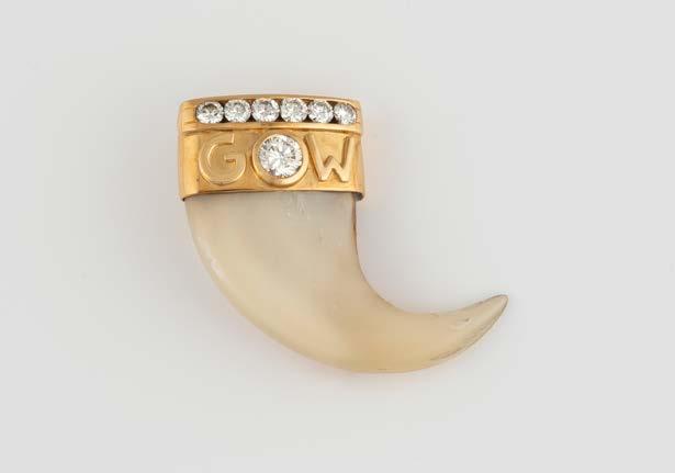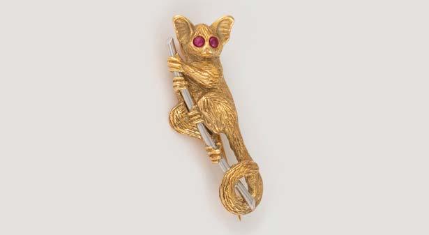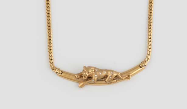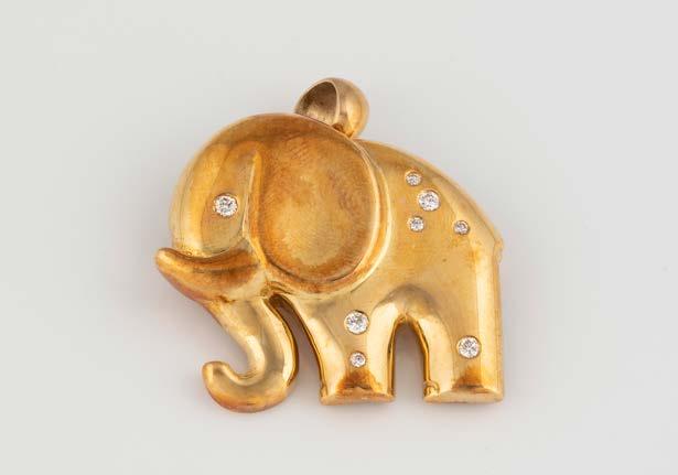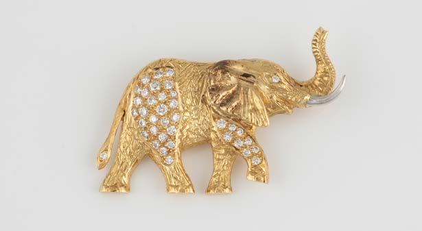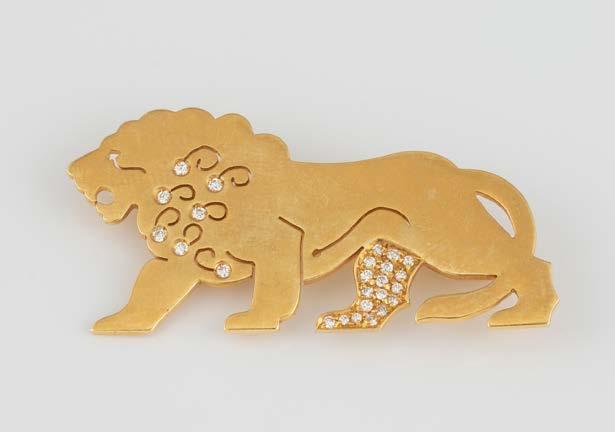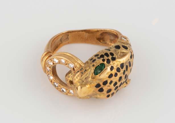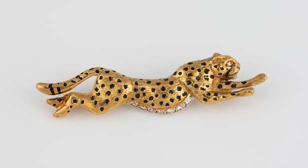 Gelbgold. 6,5 x 1,5 cm, Ges.-Gew. ca. 18,5 g. Schaustück gest. 750, persönliche Monogrammgravur. Brosche in Form eines Panthers im Lauf, schwarze Emaillierung, minimalst verlustig, ein Brillant als Auge, ca. 0,01 ct., am Bauch sieben Brillanten, zusammen ca. 0,24 ct.