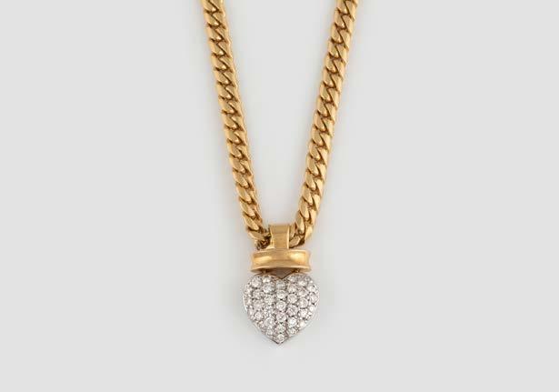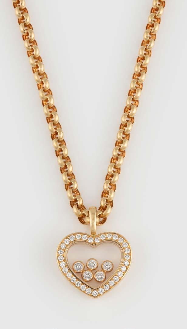 Gelbgold. Anhänger 2,0 x 1,7 cm, Ges.-Gew. ca. 5,6 g. Gest. 750, Herstellersignet, nummeriert. Herzförmiger Anhänger, Happy Diamonds, mit fünf beweglichen Diamanten, umrandet von 31 Brillanten, zusammen ca. 0,25 ct. Glas bezeichnet ‚Chopard‘. Kette L. 42 cm, Gew. ca. 17,7 g. Gest. 750, Herstellersignet.