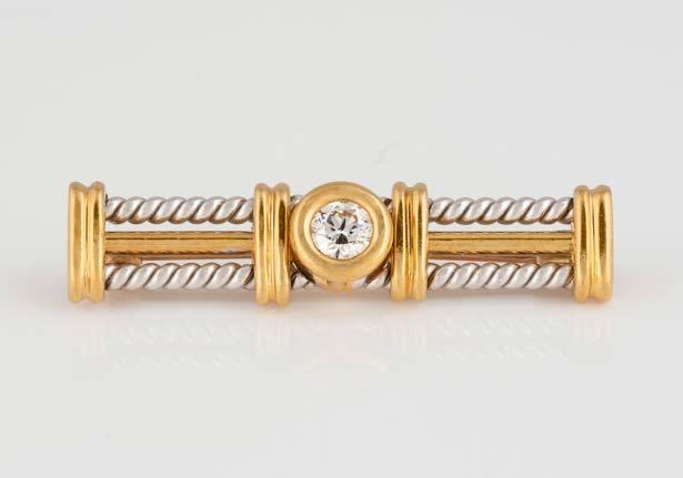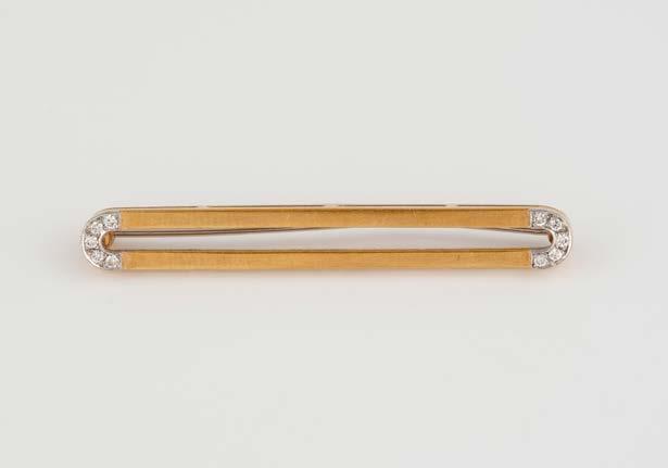 Gelbgold, Weißgold. L. 5,0 cm, Ges.-Gew. ca. 5,6 g. Gest. 750, Herstellersignet. Enden besetzt mit 10 Brillanten, zusammen ca. 0,1 ct. Nadel wohl nachträglich, leicht gebogen, ungeprüft.