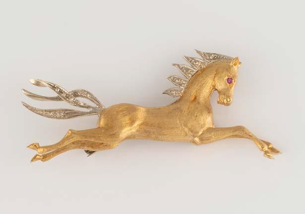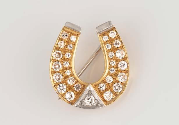 Gelbgold, Weißgold. 1,9 x 1,7 cm, Ges.-Gew. ca. 4,2 g. Gest. 750, Herstellersignet. Brosche in Form eines Hufeisens, besetzt mit 29 Diamanten im Brillant- und 8/8-Schliff, zusammen ca. 0,5 ct.