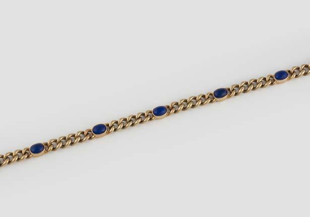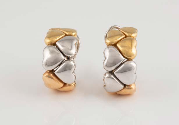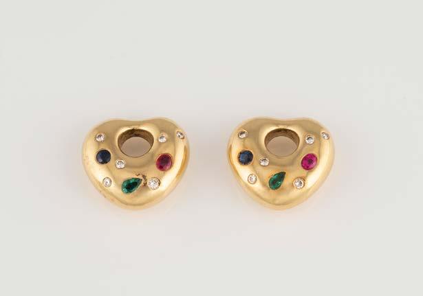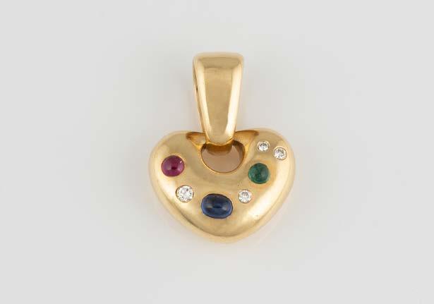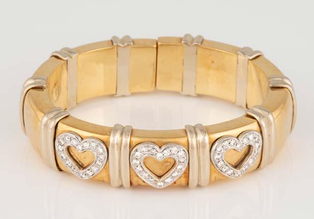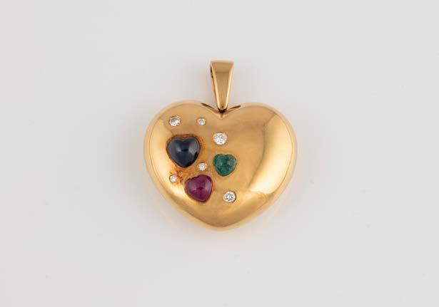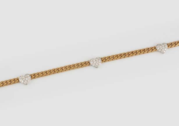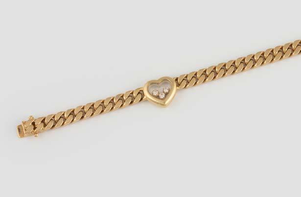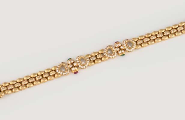 Gelbgold. L. 18 cm, Ges.-Gew. ca. 56,0 g. Gest. 750, Herstellersignet ‚Chopard Geneve‘, nummeriert. Vier Herzen mit Sichtfenster, eines davon bez. ‚Chopard Geneve‘, darin jeweils ein beweglicher Brillant, Band und Herzrahmung besetzt mit insgesamt 186 Brillanten, zusammen ca. 2,6 ct. seitlich vier Farbstein-Cabochons. Besch.