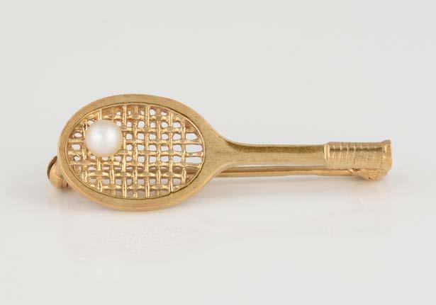 Gelbgold. 3,4 x 1,3 cm, Ges.-Gew. ca. 3,4 g. Gest. 585, Herstellersignet, wohl Albert Wittum, Pforzheim. Brosche in Form eines Tennisschlägers mit einer Perle als Ball, D. ca. 3,8 mm.