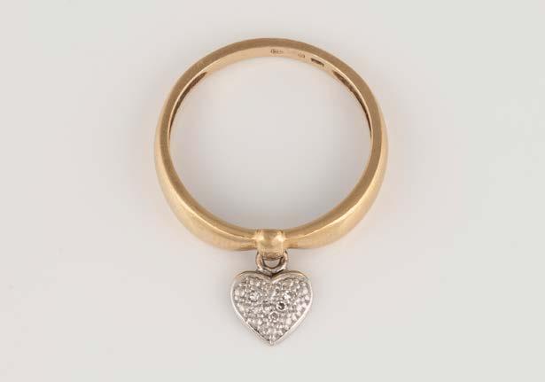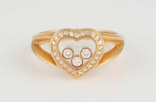Gelbgold. Ringmaß ca. 57, Ges.-Gew. ca. 7,2 g. Gest. 750, Herstellersignet ‚Chopard LUC‘. Herzförmiger Kopf mit drei beweglichen Brillanten, Glas mit Herstellersignet, umrandet von 25 Diamanten im 8/8-Schliff, zusammen ca. 0,12 ct.
