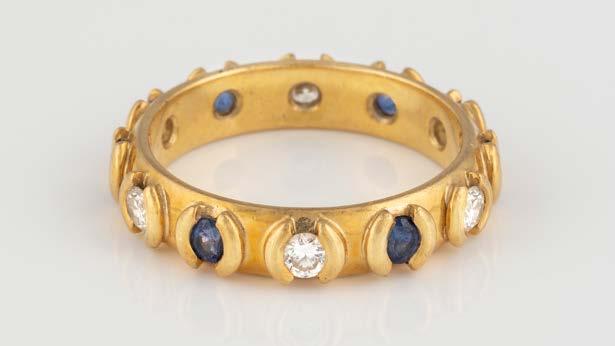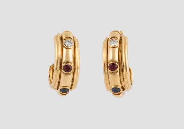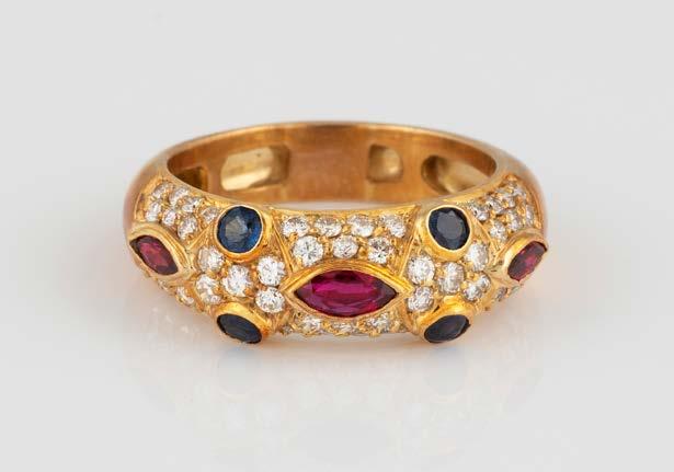 Gelbgold. Ringmaß ca. 55,5, Ges.-Gew. ca. 8,2 g. Gest. 18 K, italienische Punzierung. Drei Rubine im Navetteschliff, zus. ca. 0,32 ct., vier rund facettierte Saphire, zus. ca. 0,24 ct., 51 Brillanten, zus. ca. 0,4 ct. Leichte Tragespuren.