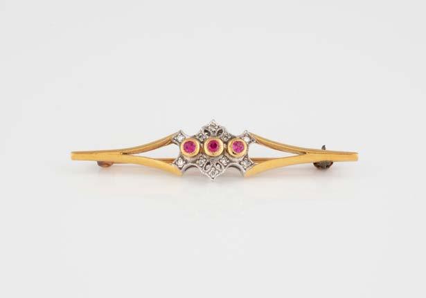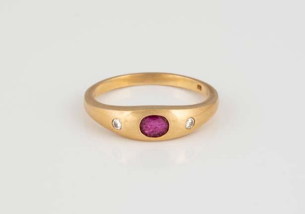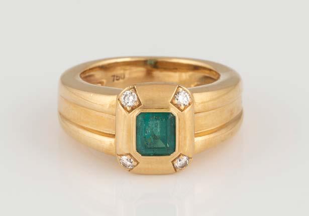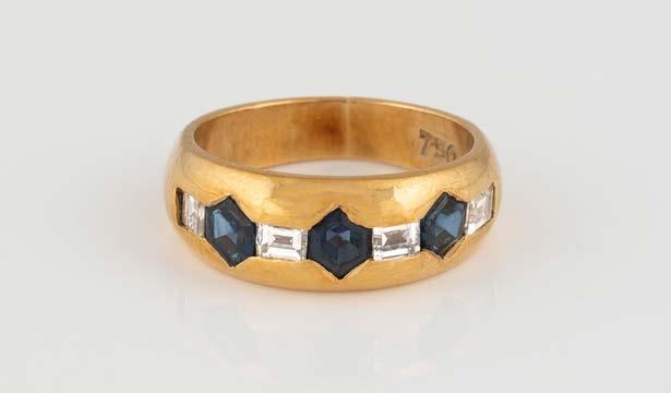 Gelbgold. Ringmaß ca. 54,5-55, Ges.-Gew. ca. 4,5 g. Gest. 18 Kt.. Drei rechteckig facettierte Rubine, zusammen ca. 0,3 ct., zwei Brillanten, zusammen ca. 0,1 ct. Leichte Tragespuren.