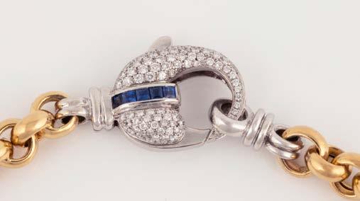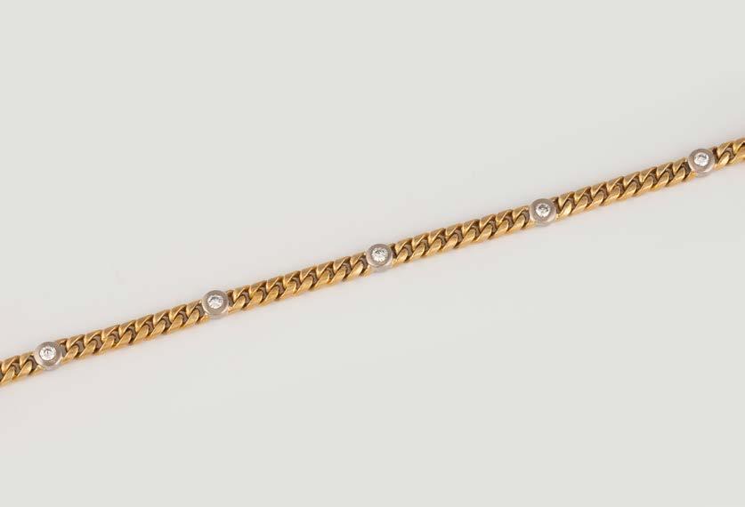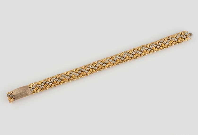 Gelbgold, Weißgold. L. 20 cm, Ges.-Gew. ca. 71,2 g. Geprüft 18 K. 72 kleine Diamanten, zusammen ca. 0,36 ct. Wohl nachträglich verlängert.