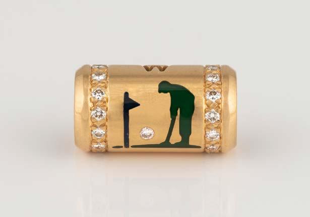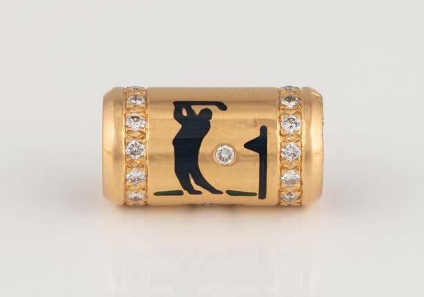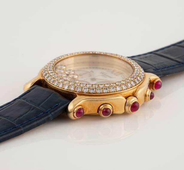 Gelbgold. L. 1,5 cm, Ges.-Gew. ca. 7,0 g. Gest. 750, Herstellersignet ‚Chopard LUC‘. Sichtfenster bez. ‚Chopard Geneve‘, jeweils drei bewegliche Brillanten, Rahmung zusammen besetzt mit 48 Brillanten, zusammen ca. 0,24 ct., jeweils ein Brillant zus. ca. 0,06 ct.