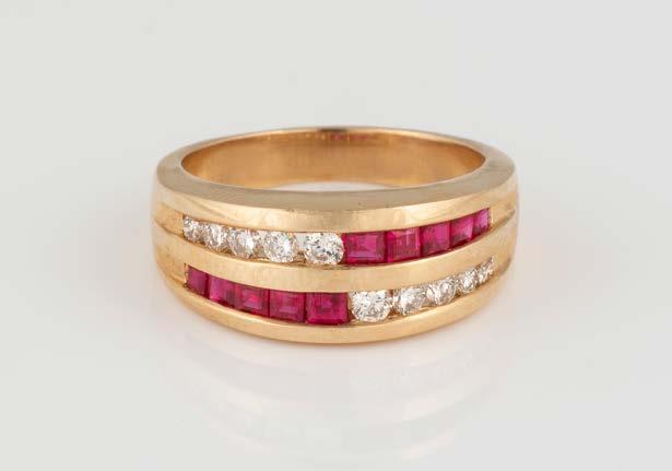 Gelbgold. Ringmaß ca. 55, Ges.-Gew. ca. 6,8 g. Gest. 14 Kt.. 10 rechteckig facettierte Rubine, zusammen ca. 0,6 ct., 10 Brillanten, zus. ca. 0,3 ct.