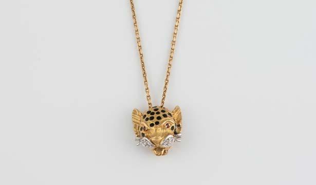 Gelbgold, Weißgold. Kette L. 45,5 cm, Ges.-Gew. ca. 7,2 g. Gest. 750, Schaustück geprüft 18 K. Pantherkopf mit zwei facettierten Rubinen als Augen, vier Brillanten, zus. ca. 0,02 ct., schwarzes Emaille.